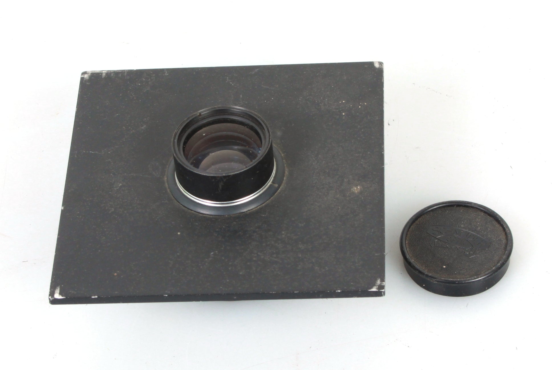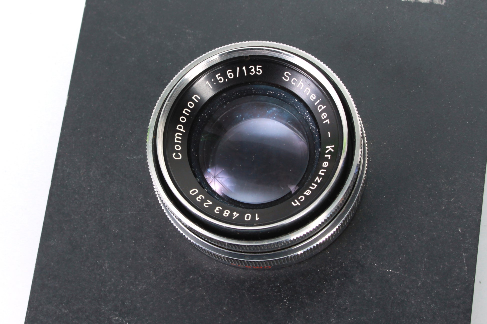 SCHNEIDER-KREUZNACH COMPONON 1:5.6/135 LENS. THERE IS SOME DUST AND HAZE PRESENT TO THE LENS BUT NO SCRATCHES. THE BARREL IS IN VERY GOOD COSMETIC CONDITION. APERTURE MOVEMENT IS SMOOTH. FITTED ON BESELER METAL LENS BOARD WHICH MEASURES 4 INCHES SQUARE. THE BOARD HAS SOME SCRATCHES. COMES WITH FRONT AND REAR LENS CAPS.