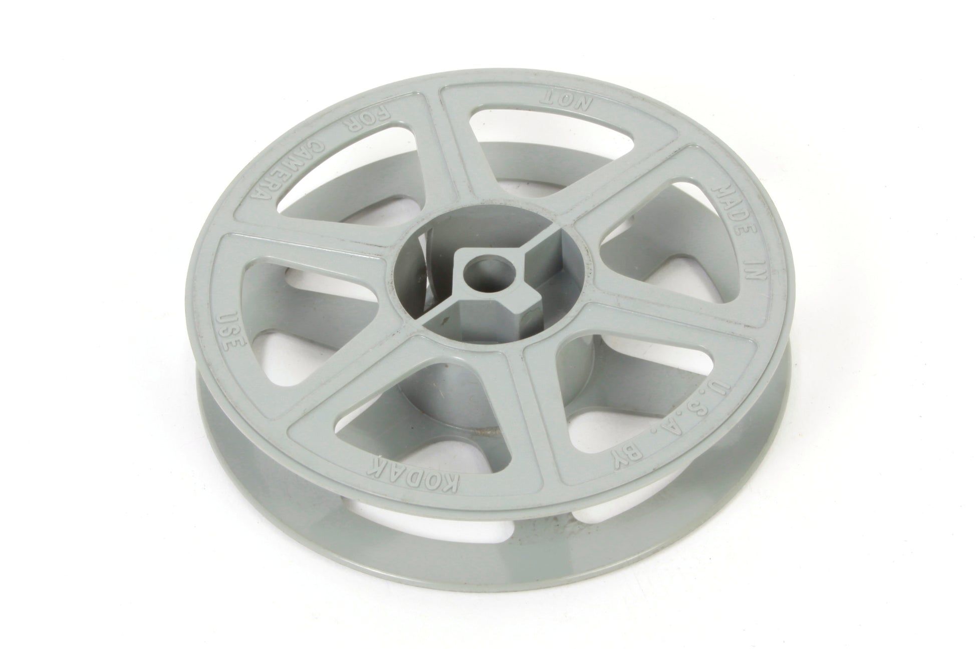 Vintage 16mm movie reel. Gray plastic. Measures approximately 3 5/8 inches diameter x 3/4 inch deep. In good vintage condition with some general signs of age and use but no obvious major damage.