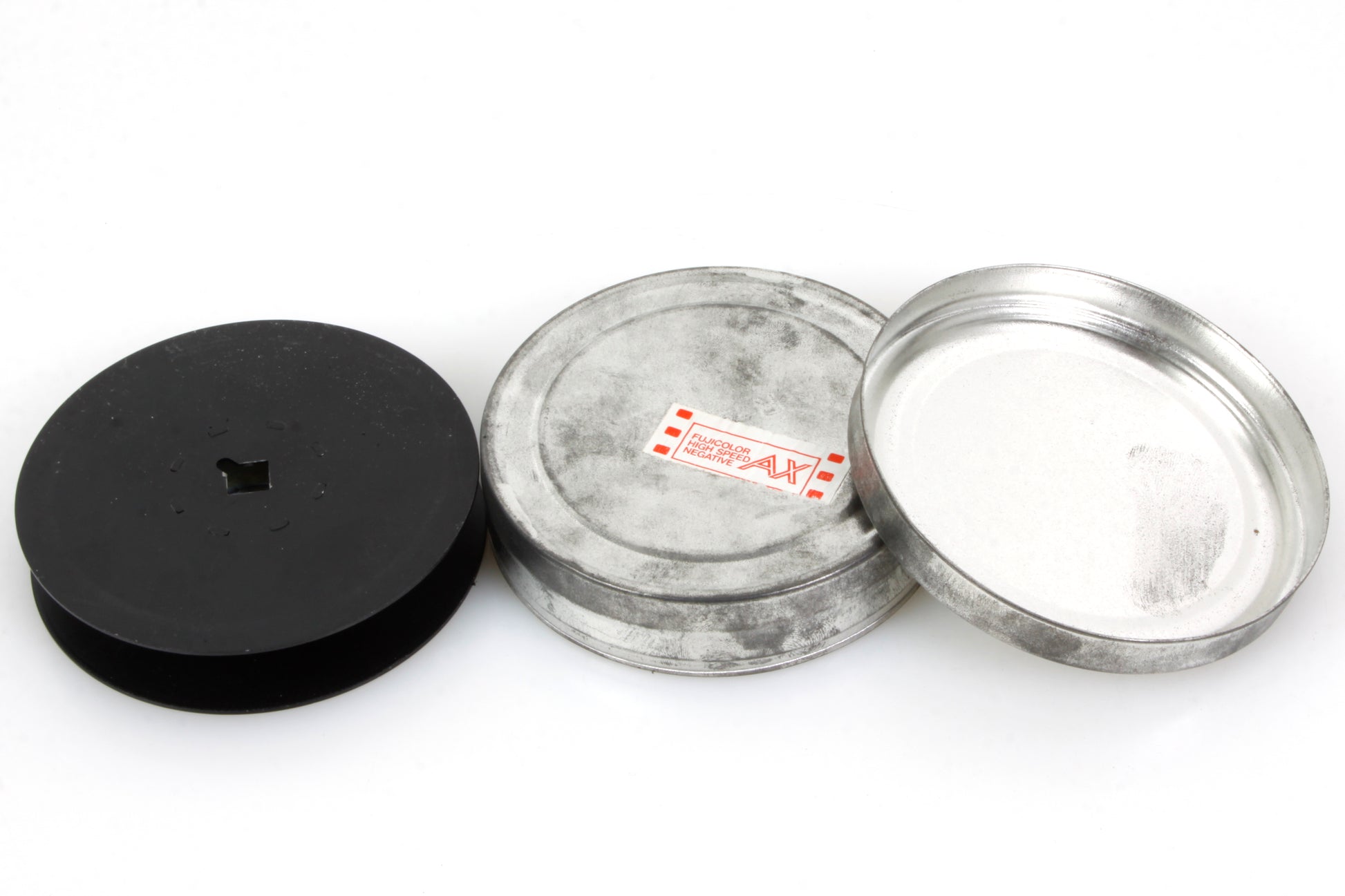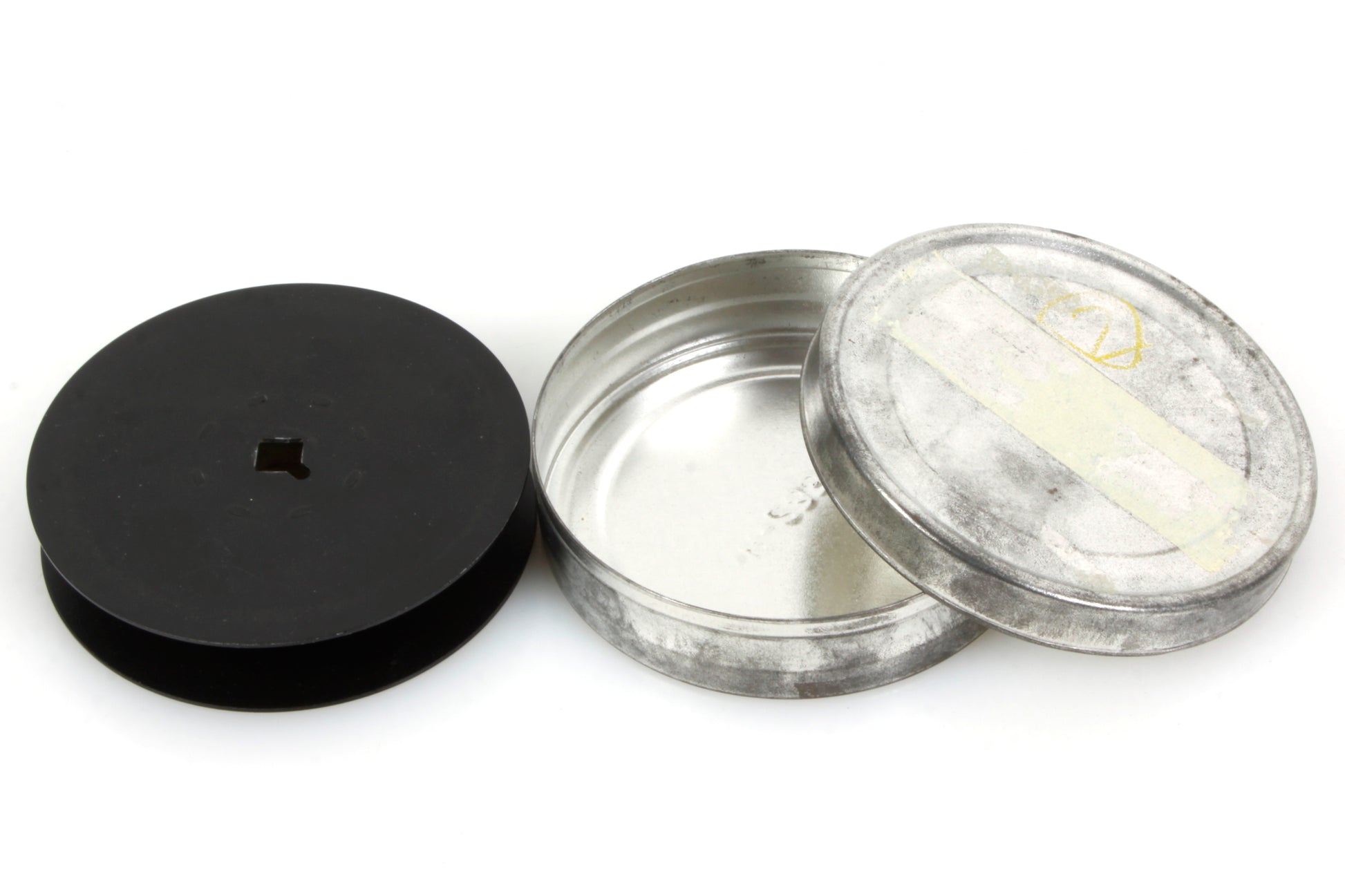 Metal 16mm movie reel and can. Approximate measurements: reel 3 9/16 x 11/16 inches, can 3 11/16 x 7/8 inches. In good vintage condition with some general signs of use. Some stickers and handwriting to the can.