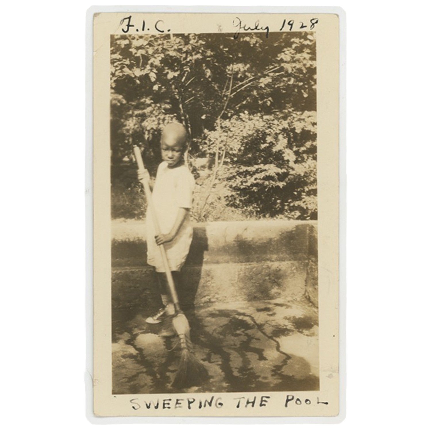 1928 VINTAGE PHOTO - AFRICAN AMERICAN GIRL SWEEPING THE POOL. INSCRIBED "PERKY"