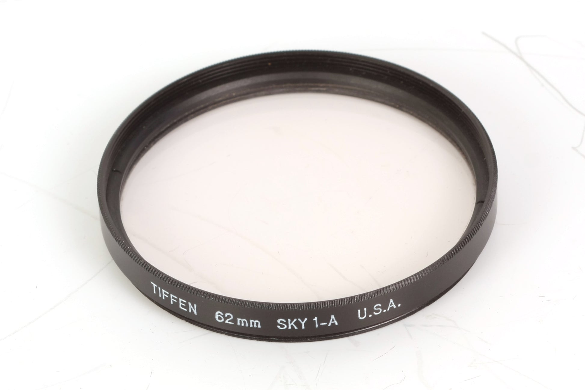 LOT OF THREE TIFFEN 62MM FILTERS: UV, SKY-1A, AND POLARIZER. ALL IN VERY GOOD USED CONDITION. ONLY SOME LIGHT SIGNS OF USE. COMES WITH ONE HARD PLASTIC CASE.