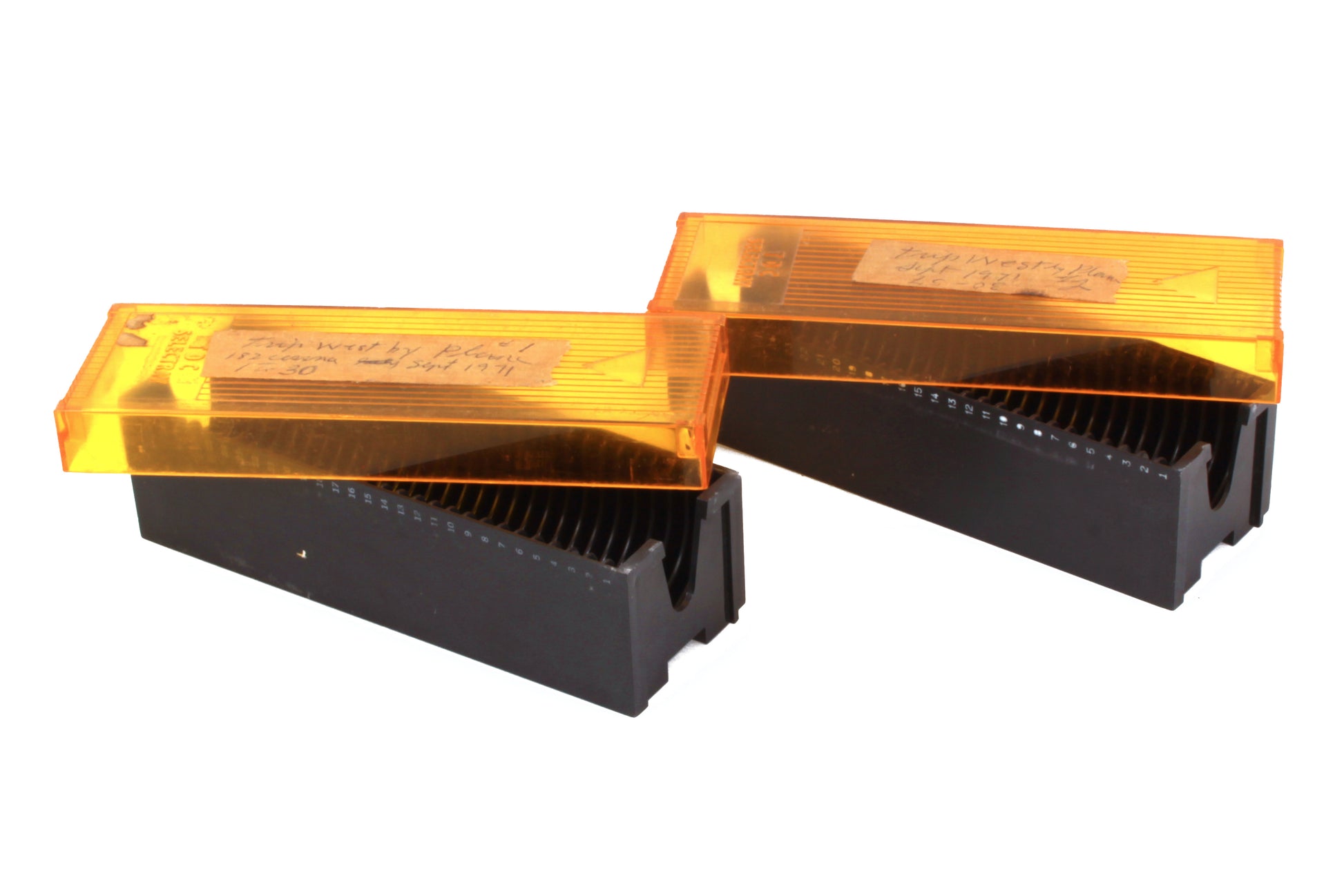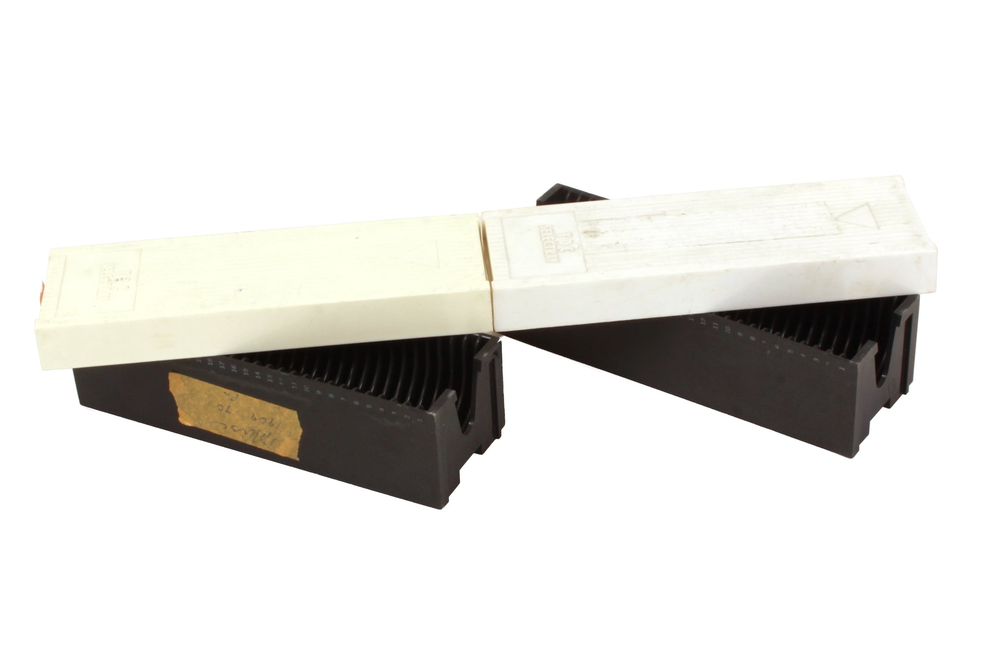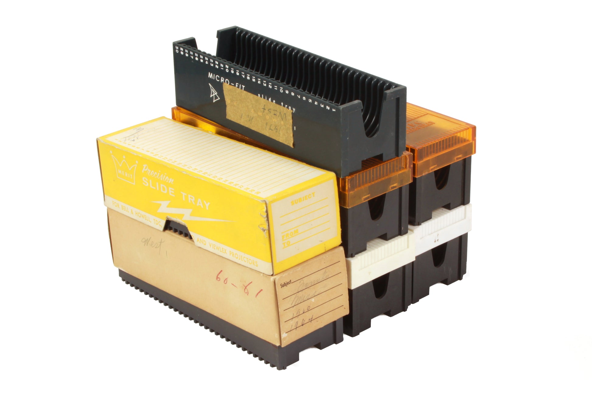 Set of 7 plastic slide changer magazines. Each holds 30 slides. 5 have lids and 2 do not. In good vintage condition with some scratches and general signs of use.