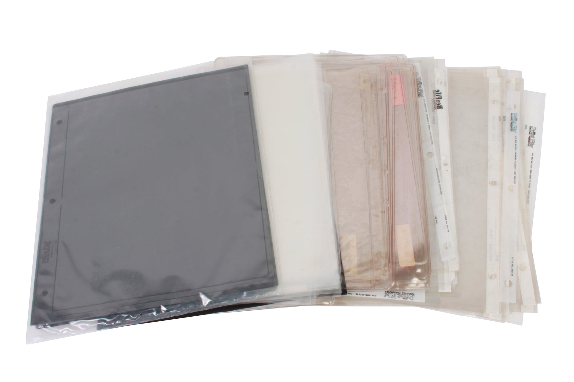 Plastic sleeves for photographs. Includes approximately 88 sheets that hold size 8 x 10 inches. Page size is approximately 9.5 x 11 inches. In good condition with some general signs of use but no obvious major damage.
