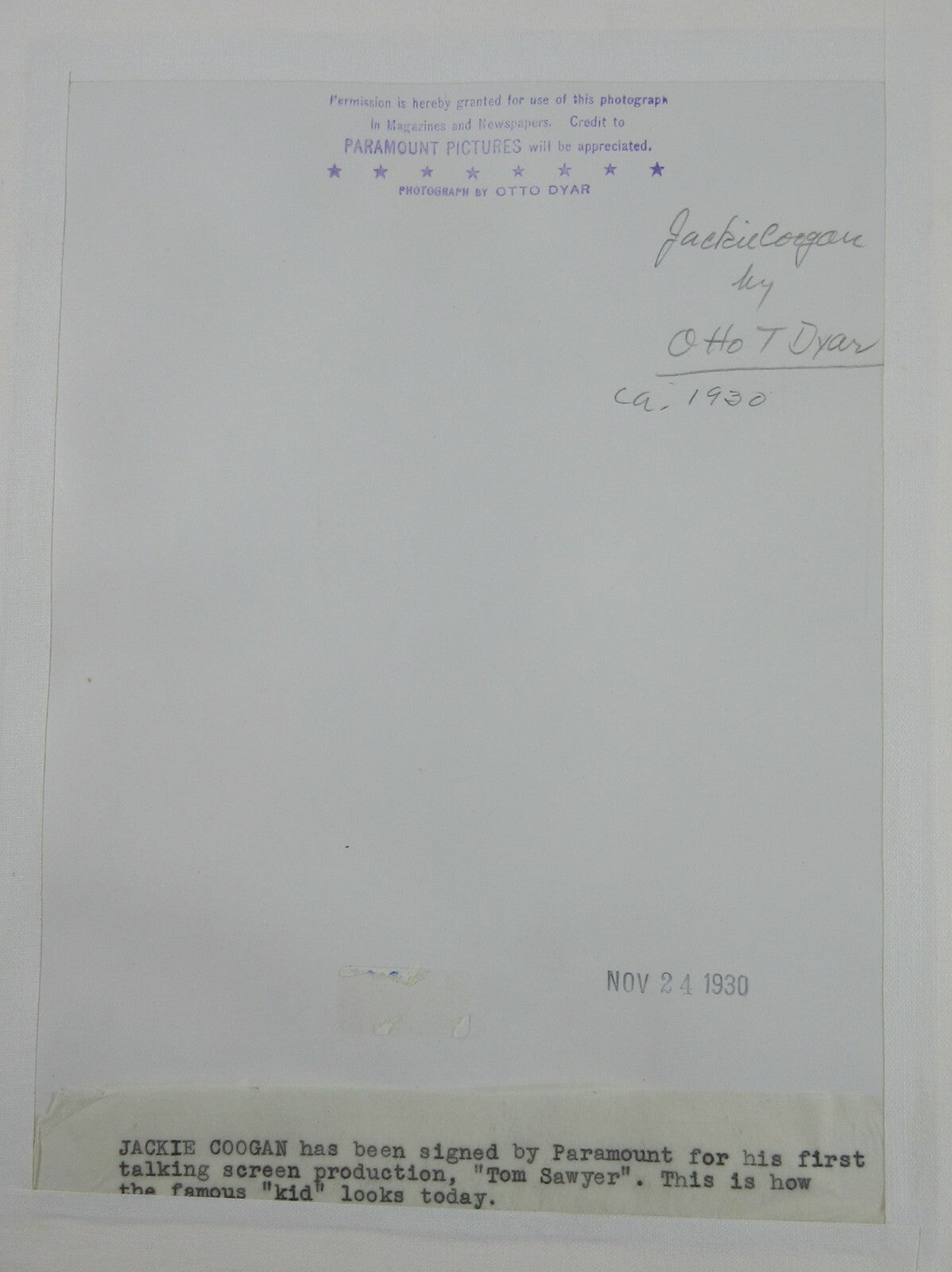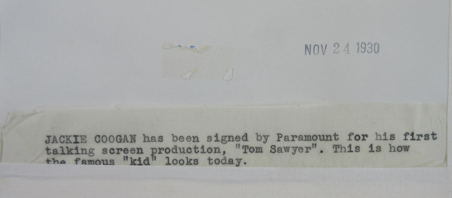 ACTOR JACKIE COOGAN. 8X10 B&W IN 11X14 ARCHIVAL MAT. IMAGE AND MAT SHOW WEAR. This item is a guaranteed authentic photo as shown from the original time period. NOT a copy, an ORIGINAL OLD PHOTO.