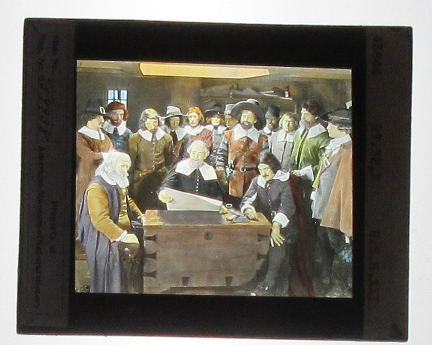 ACTORS PORTRAY MAYFLOWER PASSENGERS. HAND COLORED PHOTO ON GLASS.