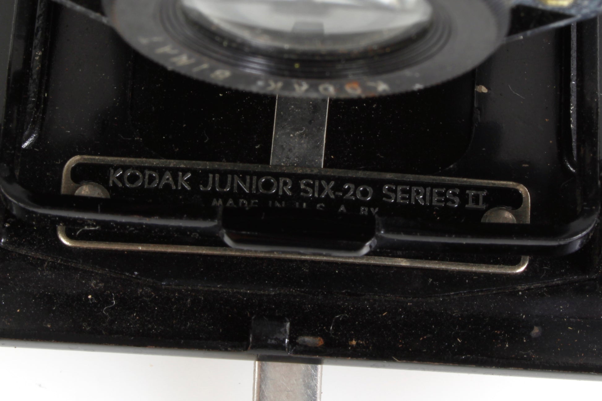 Kodak Junior Six-20 Series II camera. The shutter is firing fine on all settings, although it has not been tested with film or for accuracy. Aperture movement is fine. Cosmetically it has some damage - the viewfinder mechanism wont stay closed, the foot is bent out of place, some wear to the edges of the bellows but no visible holes. There looks to be some dust, haze and fungus present to the lens but no scratches. Some dust/dirt present to the viewfinder. Sold as is.