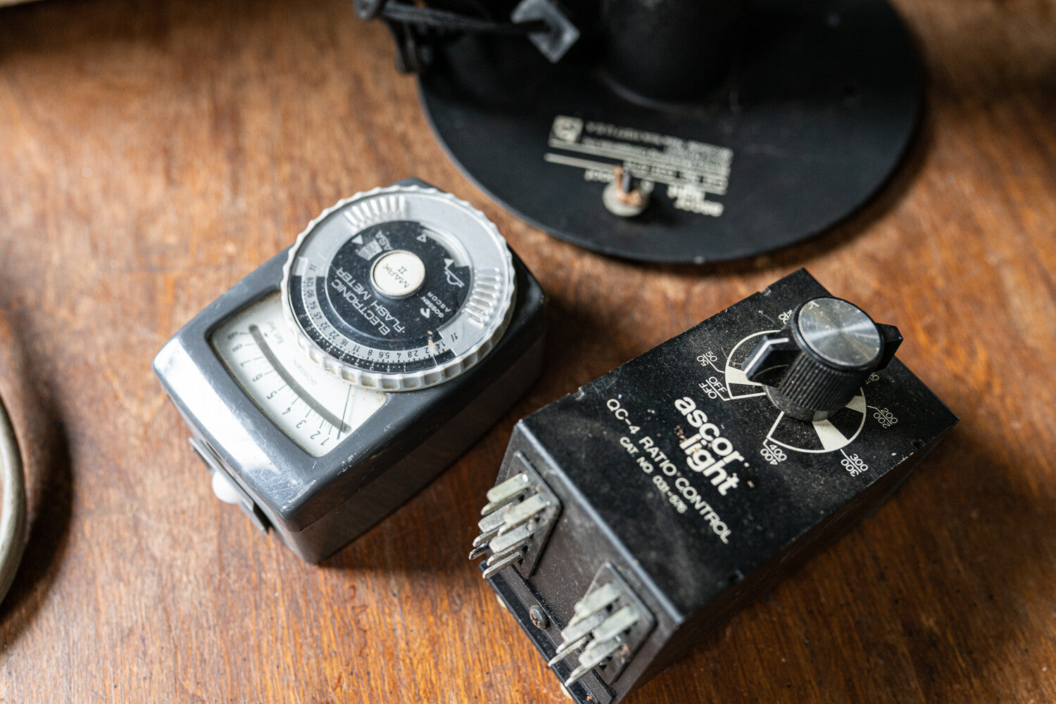Ascorlight QC4 Powerpack and 4x Flash Head Lighting Kit w/ Extras. Every flash head functions properly and has a working flash tube and modeling light. There are two extra flash tubes. There is no guarantee on the life span of the flash tubes, modeling lights, or extra flash tubes. There is an included sync to pc cable, but it is untested. The Sync plug on the powerpack is untested as well. The power cable for the powerpack includes a three pin to two pin ac plug adapter. There is an included Gossen Ascor Electronic Flash Meter Mark II that appears to not function. There are four 5" reflectors included in the kit, they are the ones attached to the flash heads in the photographs. There are two 11 1/2" reflectors included. There is an ascor 5" snoot included. There is an included ascor light QC-4 Ratio Control box. It appears to function properly. Includes information on QC-4 Modeling Light Ratio Control, as well as ascorlight QC4 Instruction Manual, and Reflectasol Bounce Light Systems "How to" Chart. Everything in the lighting kit is in fair vintage cosmetic condition! With some love and tlc, this will spice and retro up your photography studio!