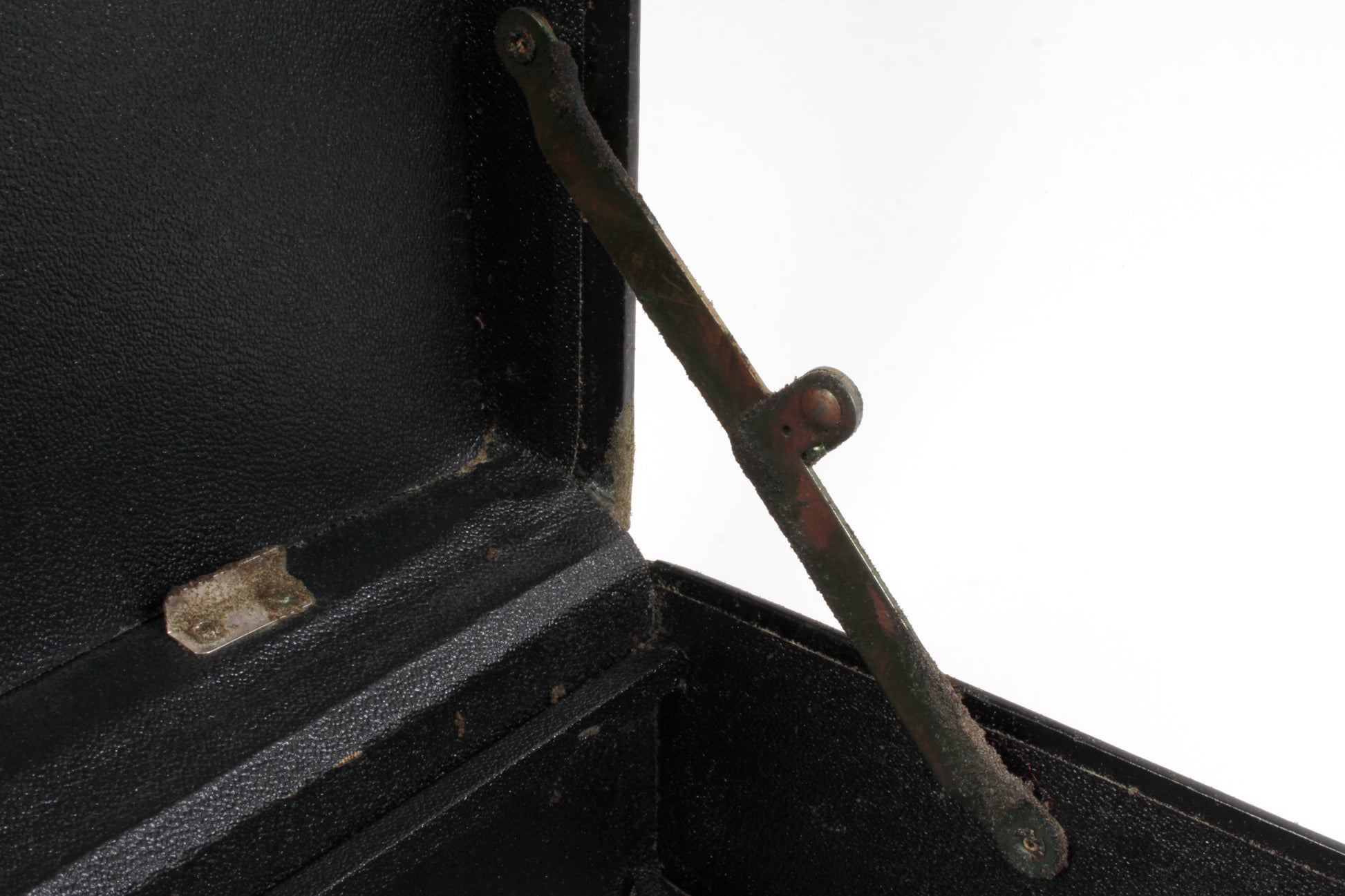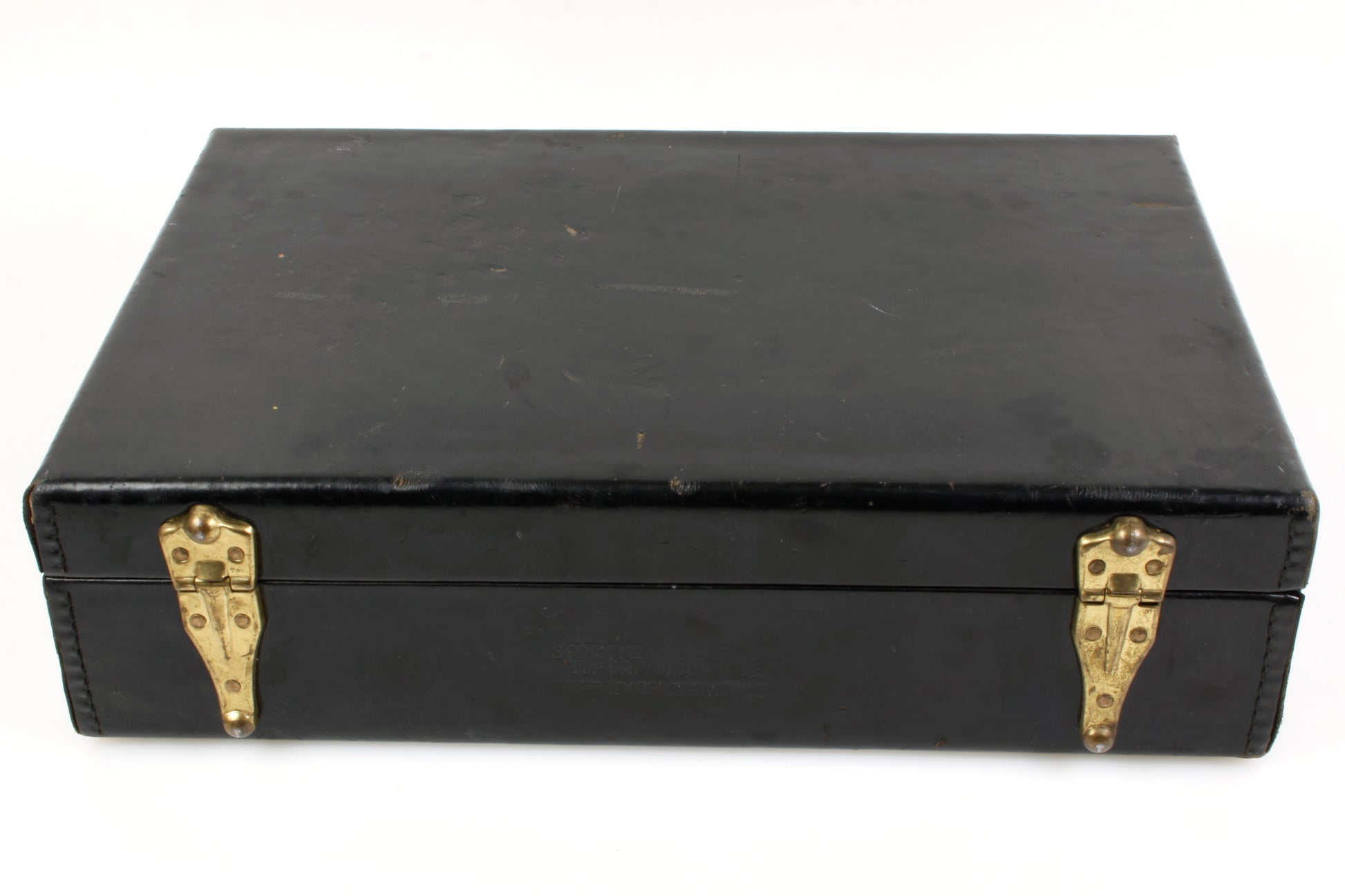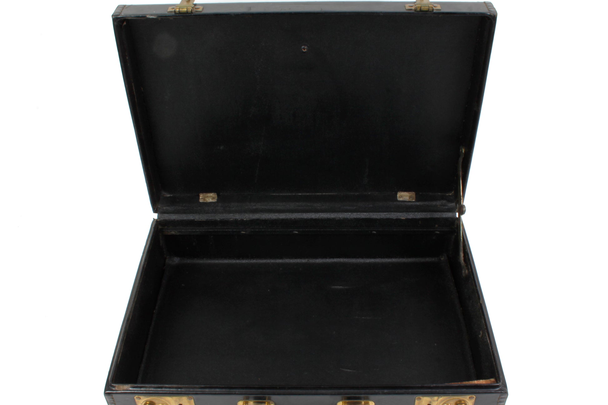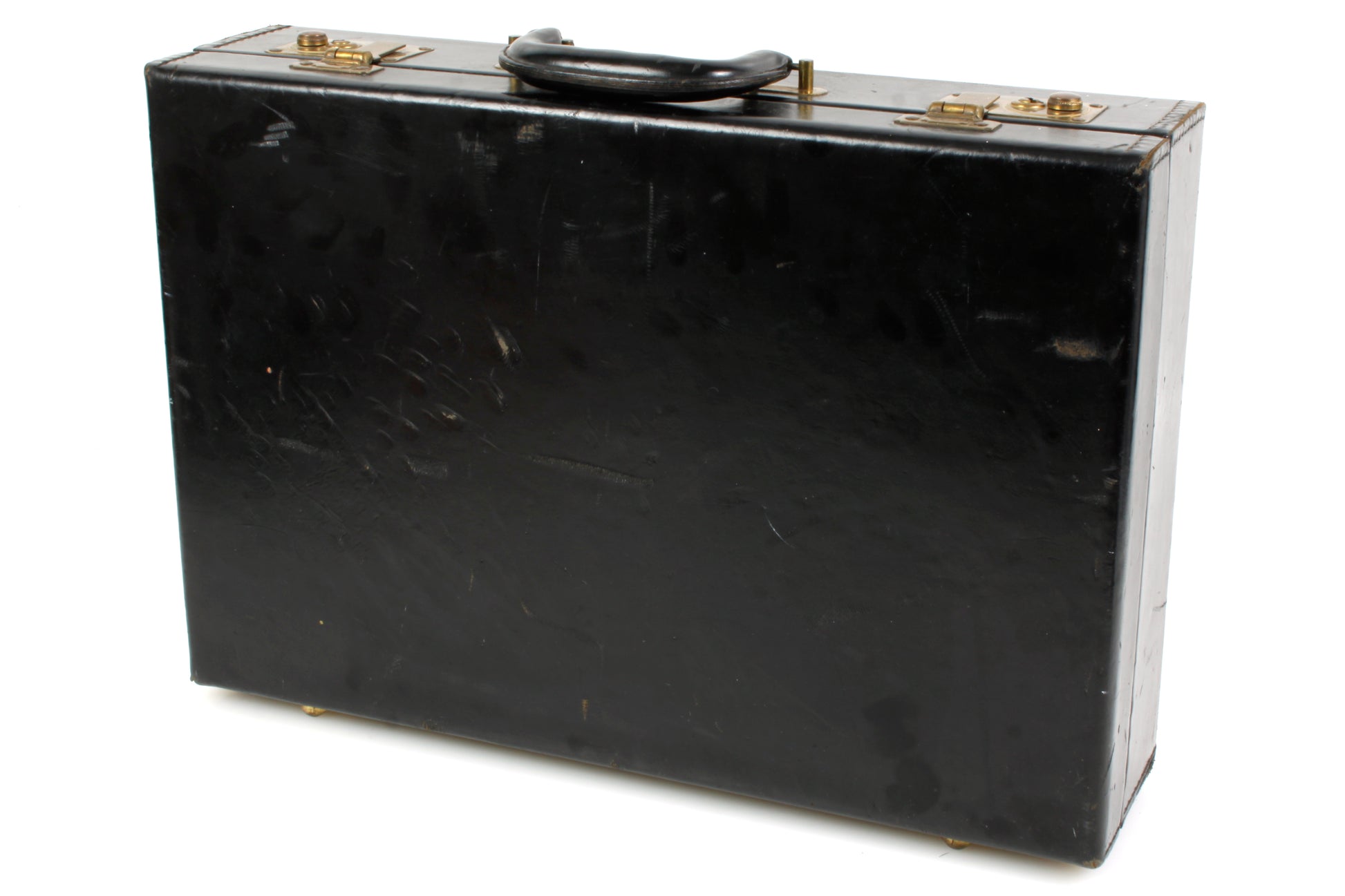 Vintage black leather attache case. Overall measurements approximately 17 3/4 x 12 x 4 3/4 inches. Interior measurements approximately 17 x 10 1/2 x 3 1/4 inches. In good vintage condition with some general signs of age and use, some scuffs and some rust/corrosion to some of the metal parts. Does not come with key.