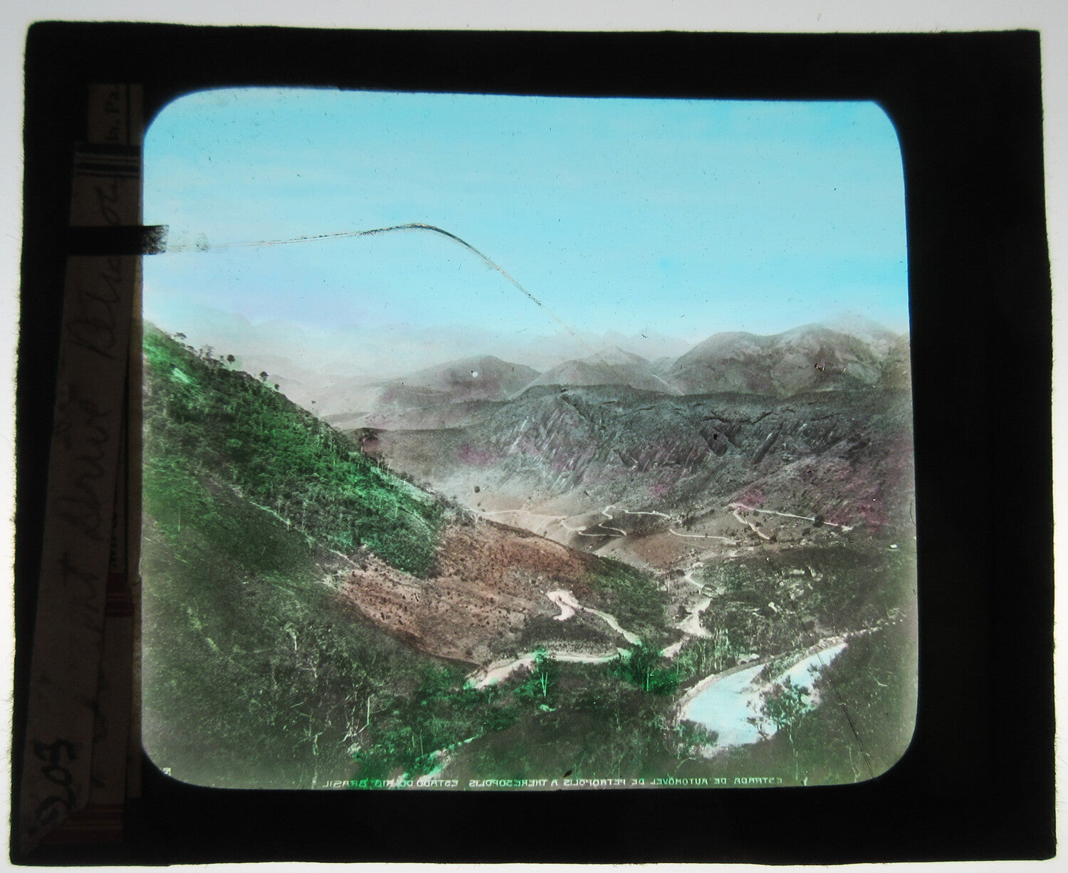 BEAUTIFUL VIEW OF WINDING MOUNTAIN ROAD. HAND COLORED PHOTO ON GLASS.