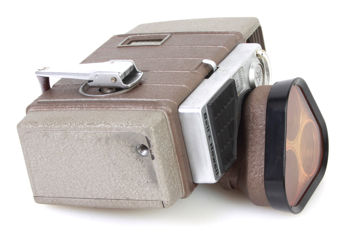 Bell & Howell Electric Eye movie camera. The motor and winder are not working. They seem to be stuck. We do not know what the issue is so it is being sold as is. For prop or display only. Cosmetically it is in good vintage condition with some marks and wear. Some dust present to the lenses but they look to be clear of haze and scratches. Some haze to the viewfinder but no cracks.