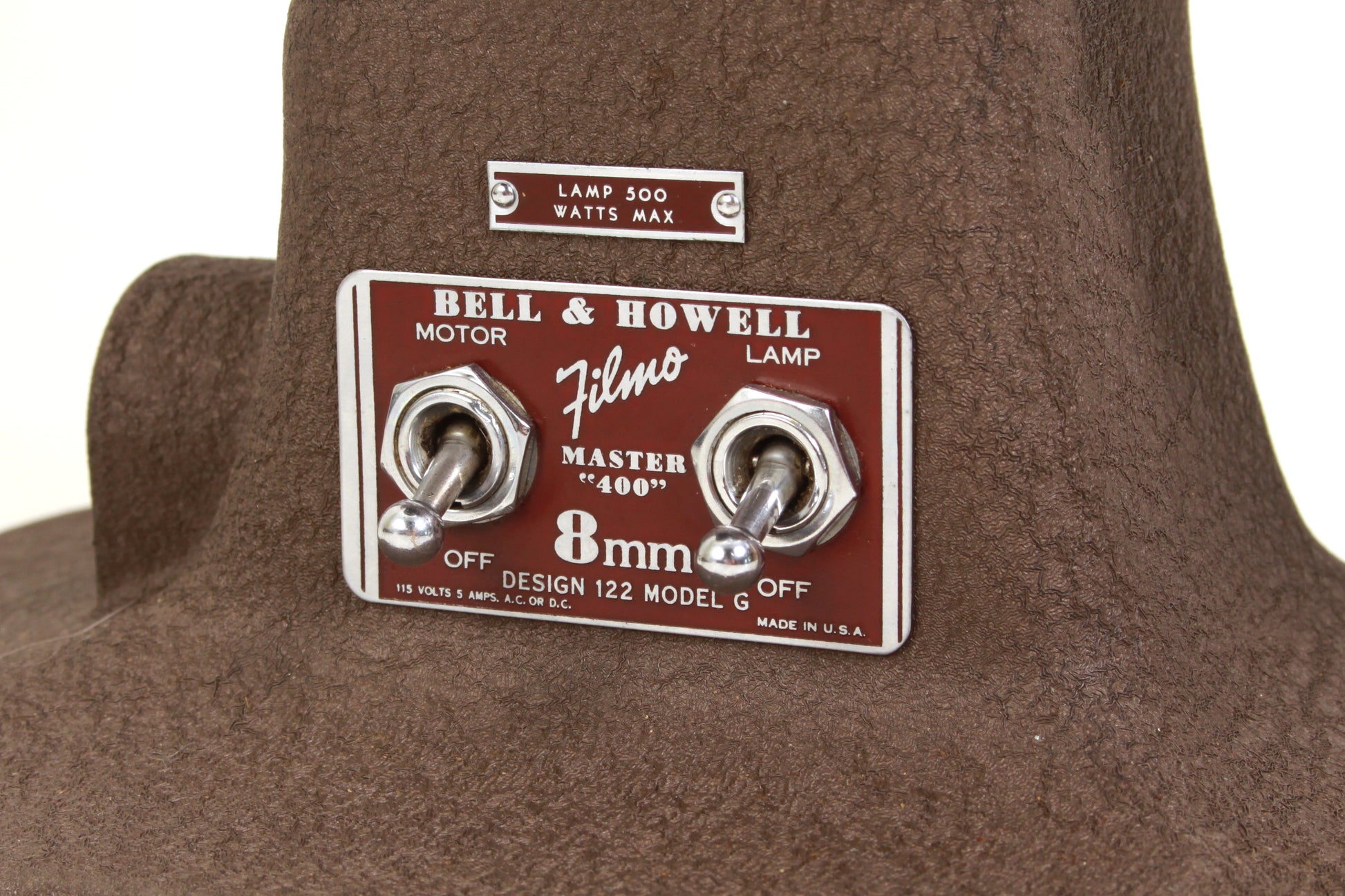 BELL & HOWELL FILMO MASTER 400 DESIGN 122 MODEL G 8MM FILM PROJECTOR WITH 1 INCH F/1.6 LENS. LOOKS TO BE IN WORKING ORDER, ALTHOUGH IT HAS NOT BEEN TESTED WITH FILM OR FOR ACCURACY. THE MOTOR IS WORKING. THE LAMP IS NOT BUT IT MIGHT JUST NEED A NEW BULB. COSMETICALLY IT IS IN GOOD VINTAGE CONDITION. SOME GENERAL SIGNS OF AGE AND USE BUT NO OBVIOUS MAJOR DAMAGE. THERE IS A LITTLE DUST AND HAZE PRESENT TO THE LENS. COMES WITH ITS ORIGINAL CASE WHICH MEASURES APPROXIMATELY 15 X 12 7/8 X 8 1/8 INCHES. THE CASE HAS SOME WEAR AND TEAR.