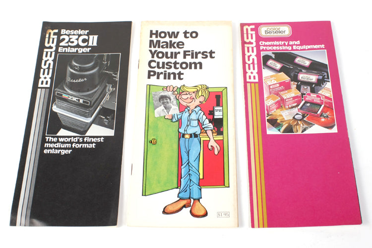 SET OF THREE BROCHURES INCLUDING: BESELER 23CII ENLARGER, HOW TO MAKE YOUR FIRST CUSTOM PRINT, AND CHEMISTRY AND PROCESSING EQUIPMENT. OVERALL IN GOOD USED CONDITION. SOME CREASES, SOME SIGNS OF USE AND AGE, SOME WRITING ON THE BACK OF ONE BROCHURE.