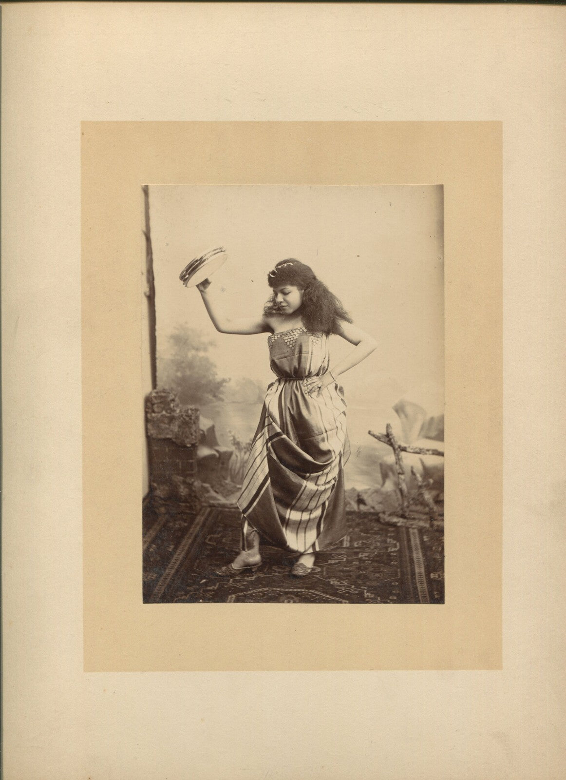 BLACK ACTRESS POSED PLAYING TAMBOURINE. 6.5X4.5 ALBUMEN ON 12X9.5 CARD.