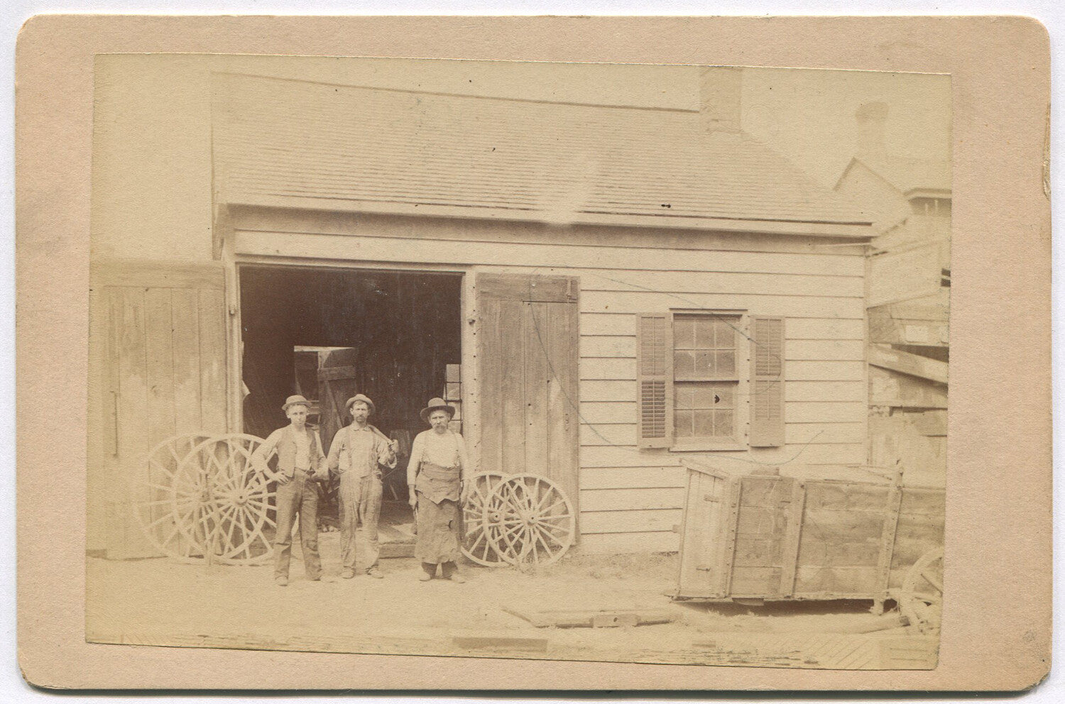 BLACKSMITH SHOP EXTERIOR. WORKERS WITH WHEELS AT DOOR. CABINET CARD. N.Y.