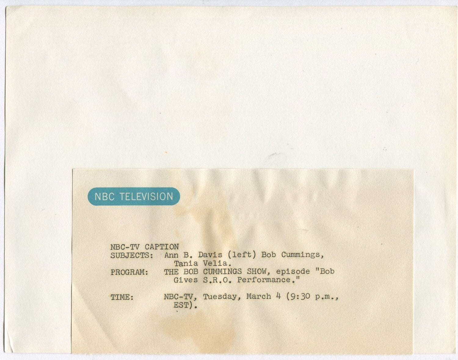 BOB CUMMINGS TV SHOW PUBLICITY PHOTO, 8X10 B&W.