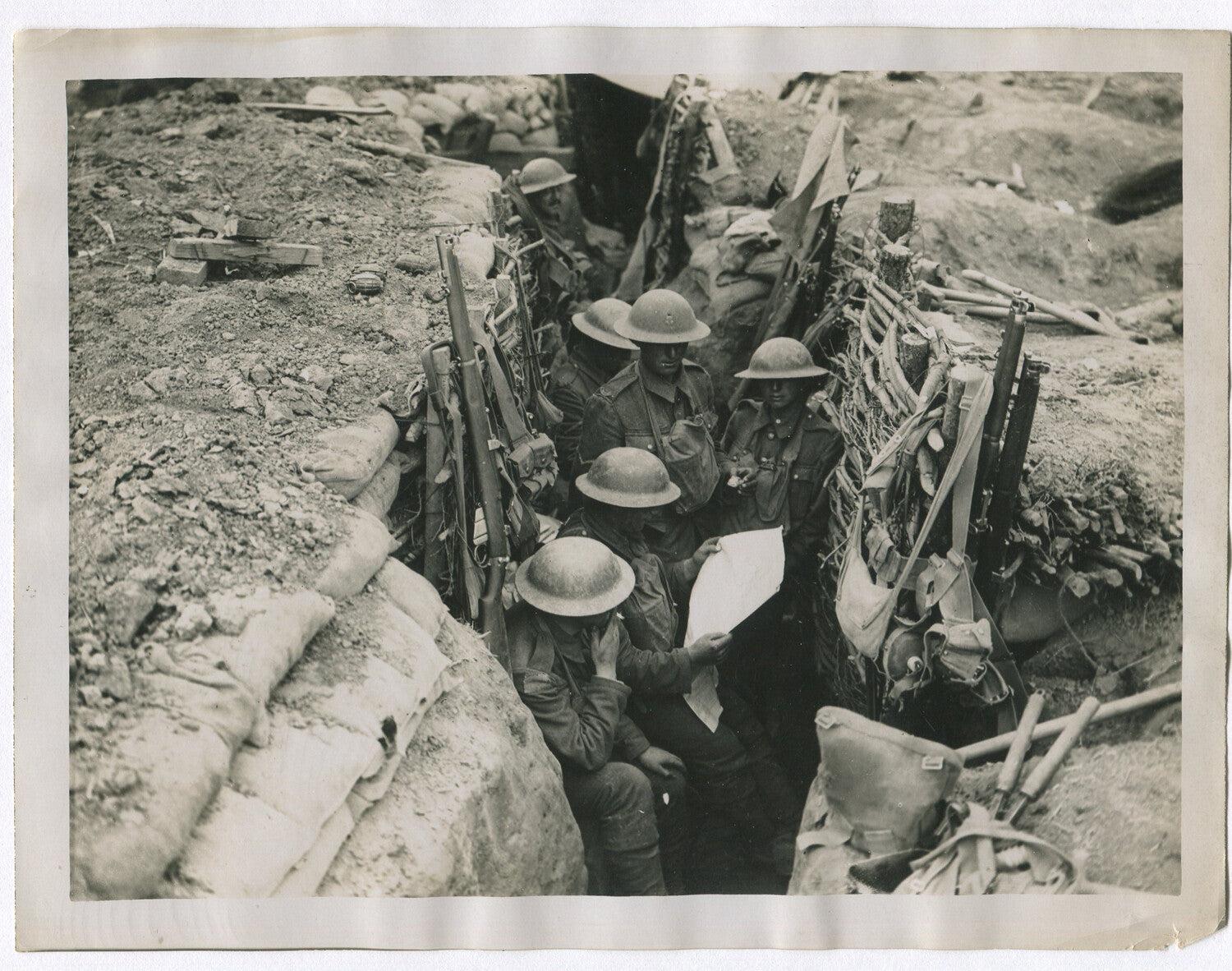 BRITISH TROOPS READING THE NEWS 1000 YARDS FROM THE FRONT. WWI. (8X10 REPRINT)