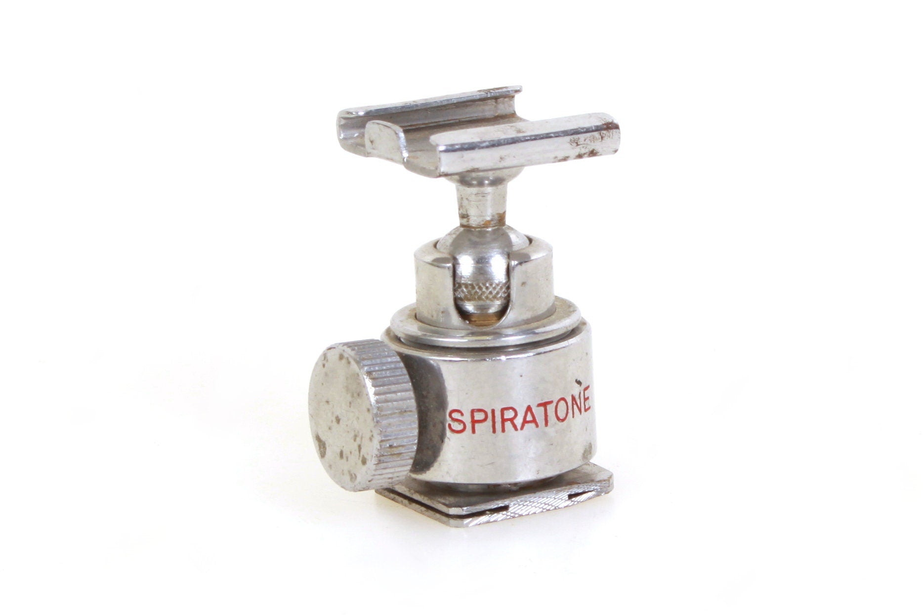 Spiratone metal adjustable ball head attachment. Overall size approximately 1.5 inches tall x 1 inch wide x 0.75 inch deep. In good vintage condition with some scratches and some tarnishing to the metal in places.
