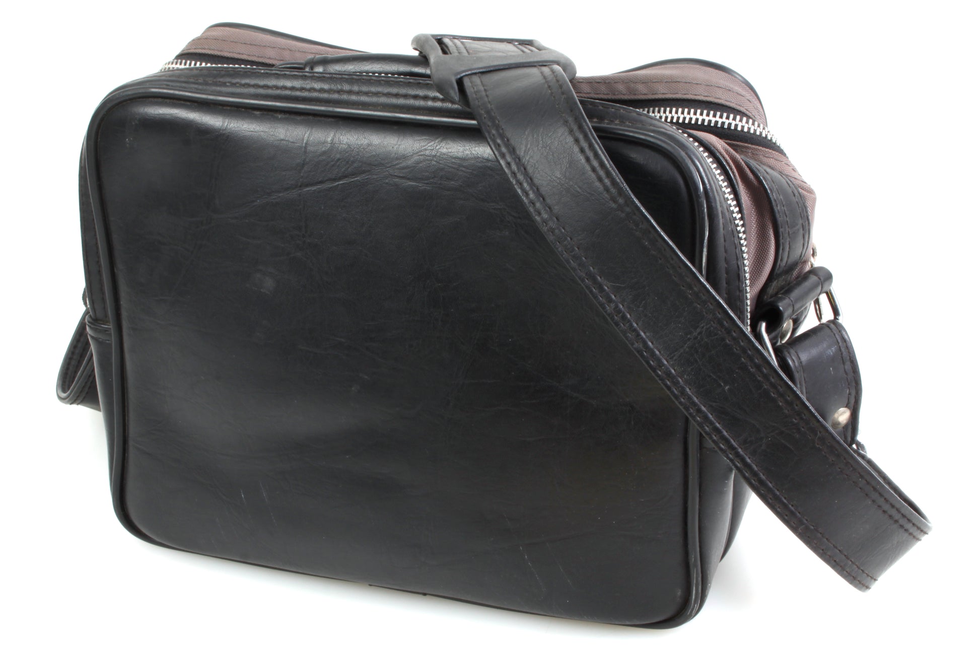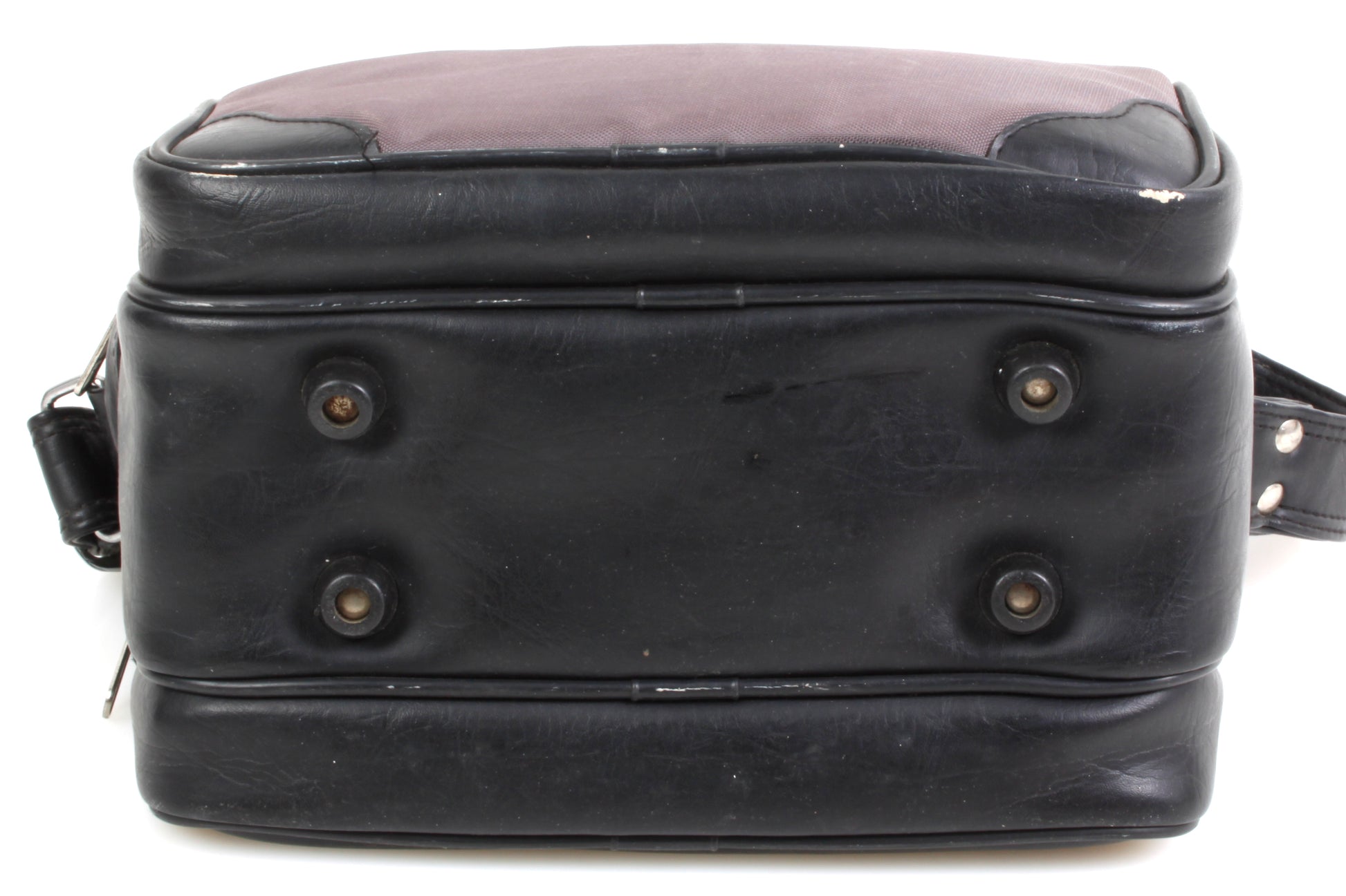 Vintage gray and black bag with shoulder strap. There are two compartments and one pocket. Main compartment interior measures approximately 10 x 7 x 4 inches. Exterior measures approximately 11 x 8 1/4 x 7 inches. In good vintage condition with some general signs of age and use.