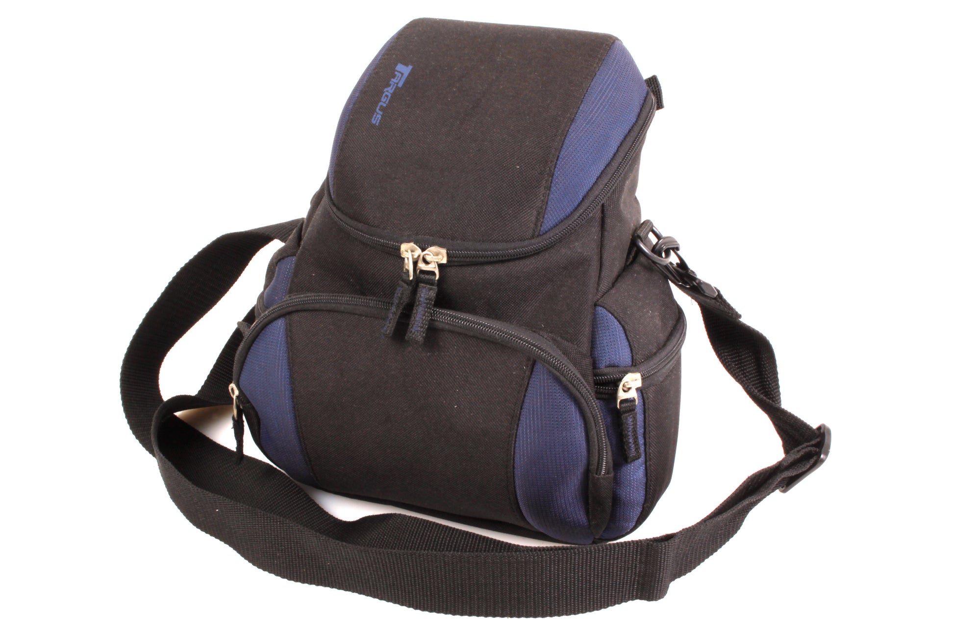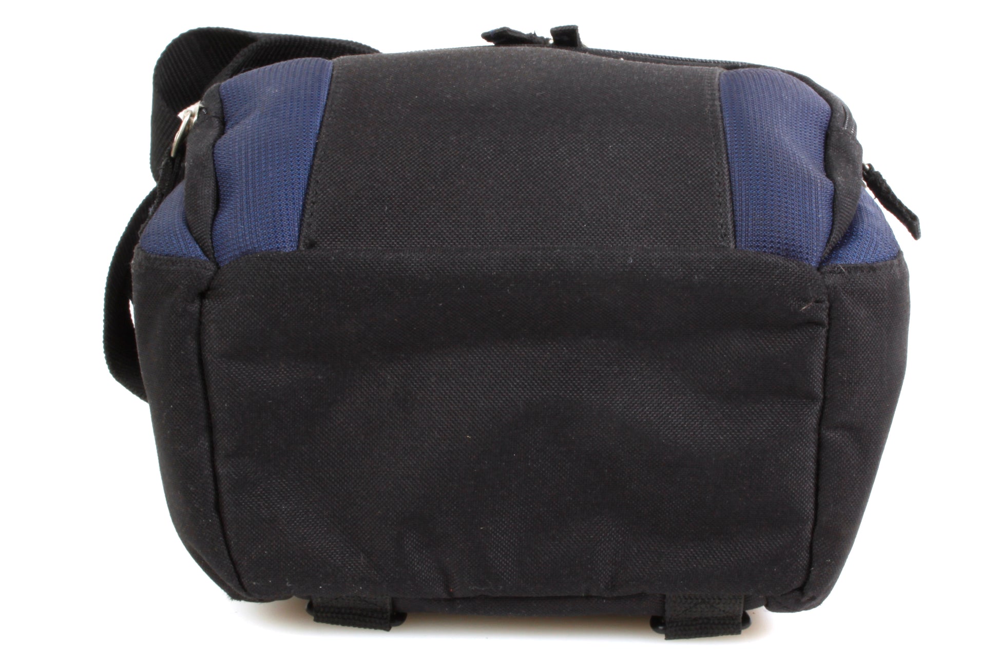 Targus black and blue camera bag with detachable shoulder strap. Exterior measurements approximately 10 x 9 x 6 inches. Interior measurements approximately 8 x 7.5 x 4 inches. In very good condition with light signs of use.