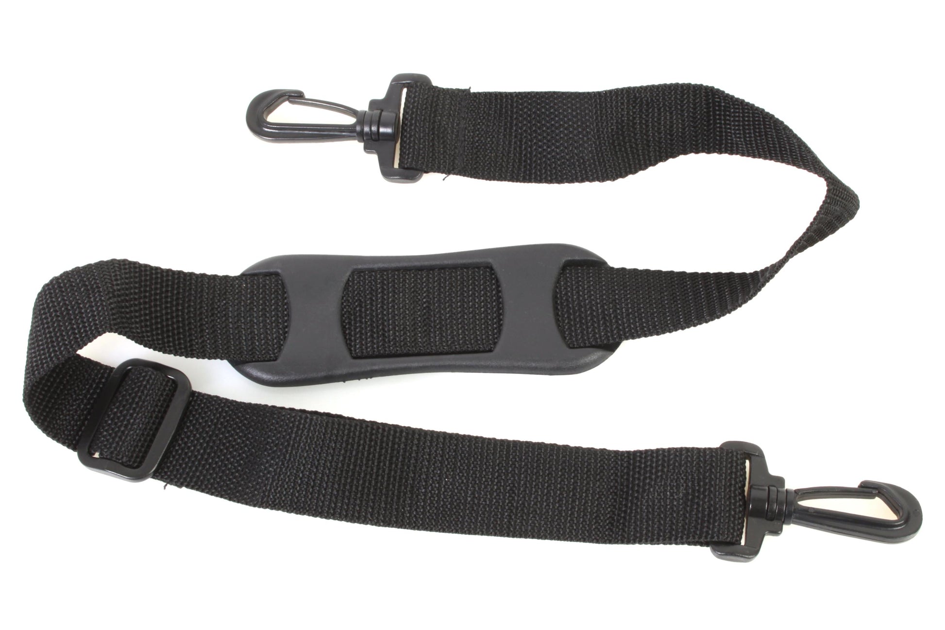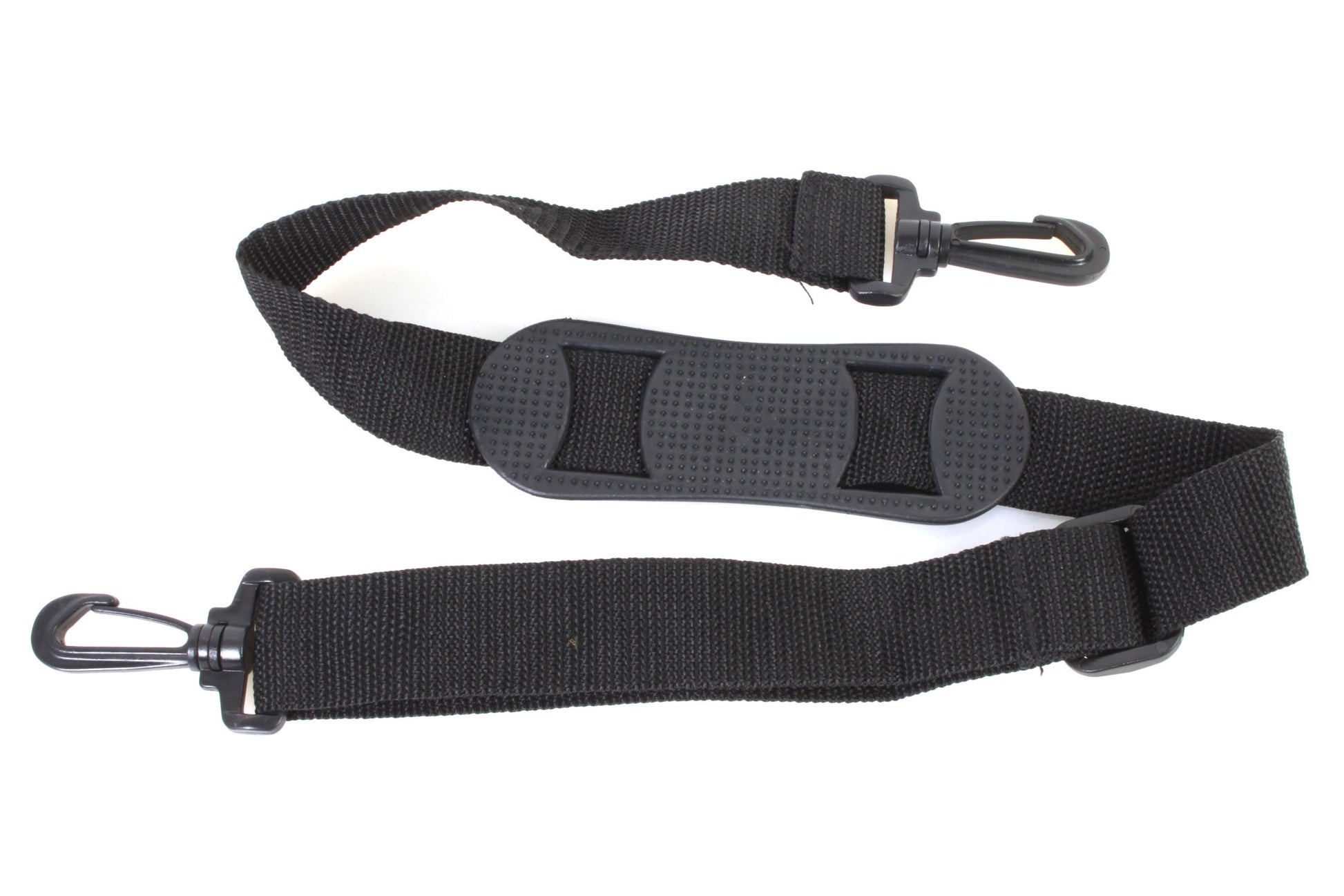 Vintage black strap with rubber neck pad and plastic clips. Measures approximately 1 1/4 inches wide and 41 inches long at its longest (length is adjustable). In very good vintage condition with some light signs of use.