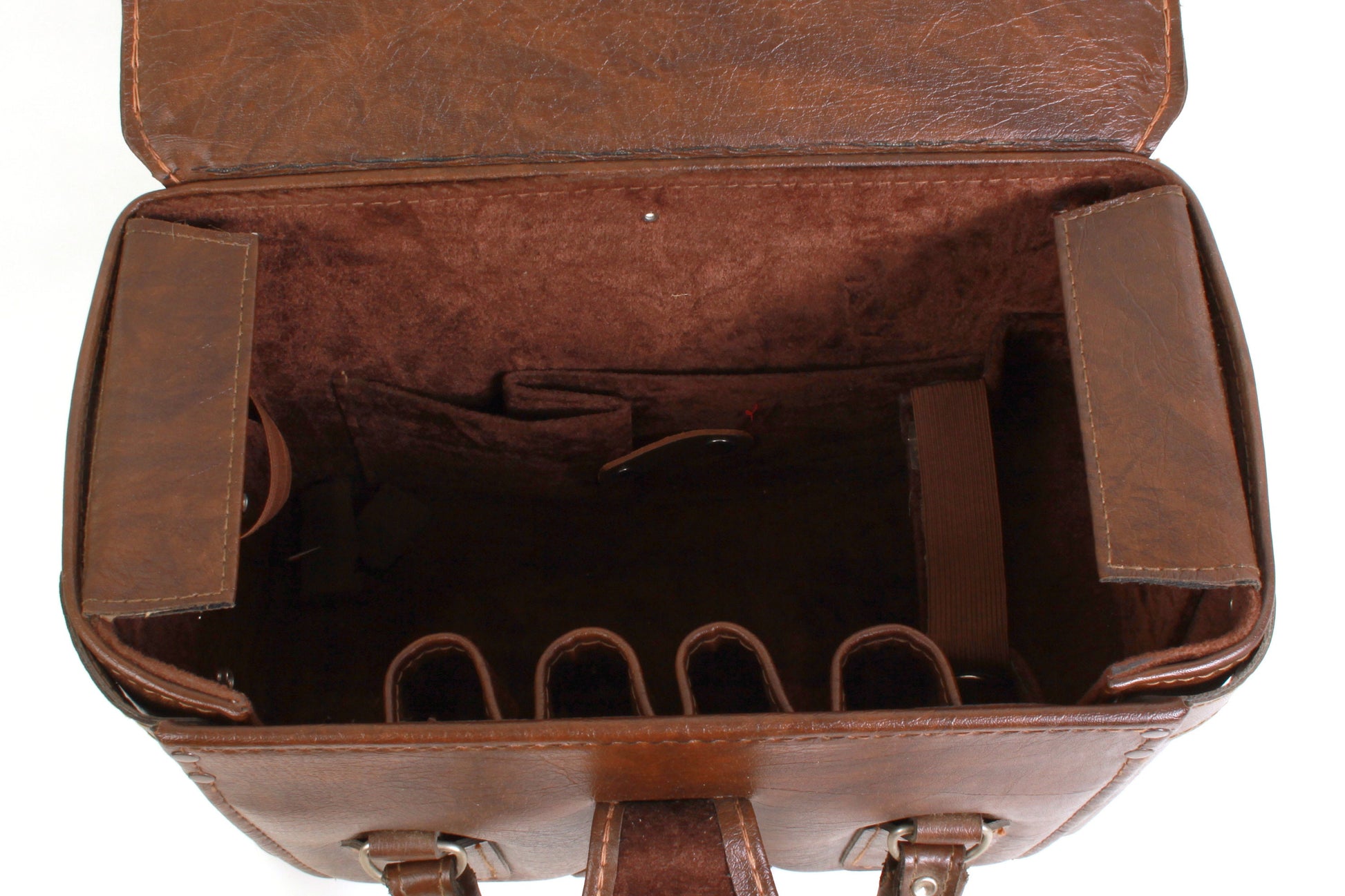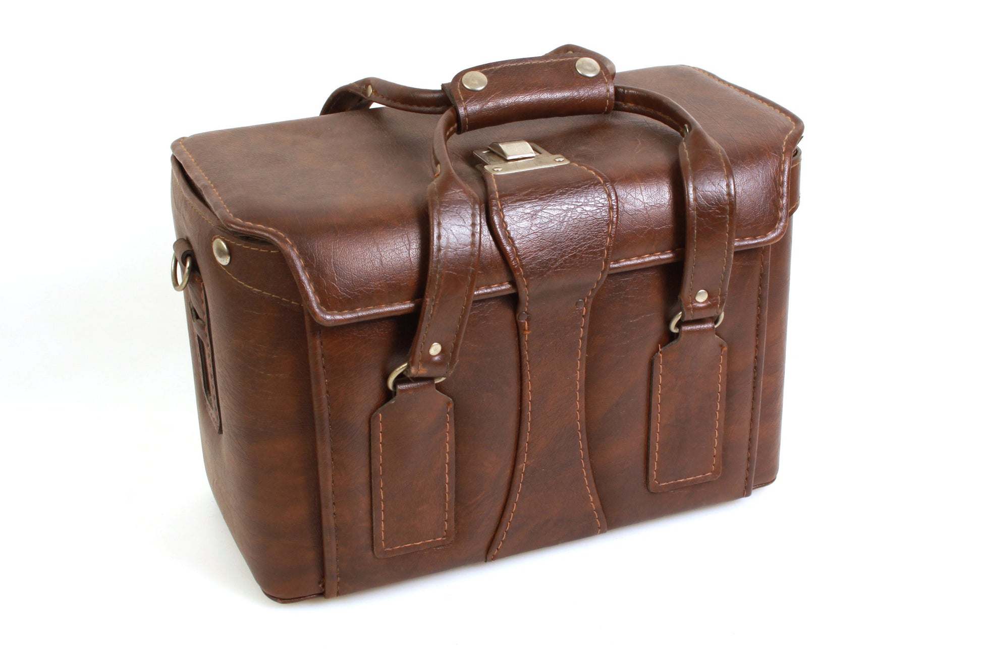 Vintage dark brown vinyl camera case with top handle. There is one main compartment with some elastic holders and adjustable dividers. Overall size approximately 13.75 inches wide x 7 inches deep x 9.75 inches tall. The main compartment interior measures approximately 13 inches wide x 7 inches deep x 8.75 inches tall. There is no shoulder strap but there are rings on each end to attach one. In very good vintage condition with some general signs of age and use but no obvious major damage.
