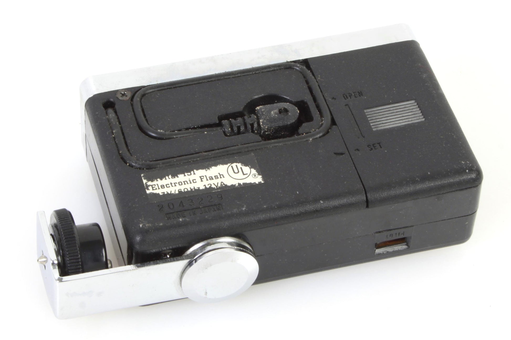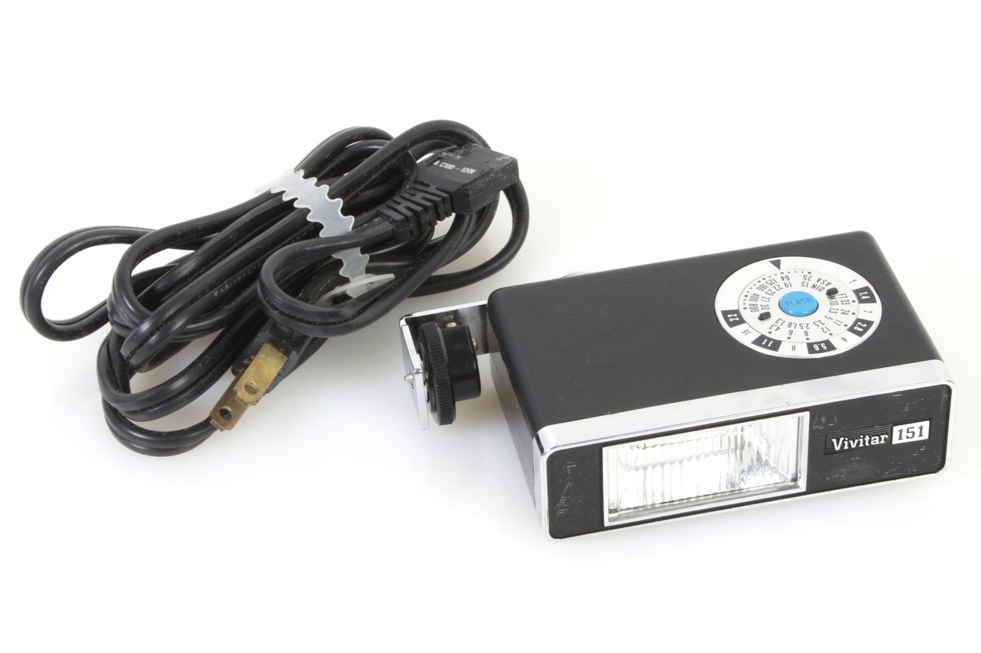 Vivitar 151 flash with AC cord. AC only. In working order, although it has not been tested for accuracy. Cosmetically it is in good vintage condition with some scratches and wear.