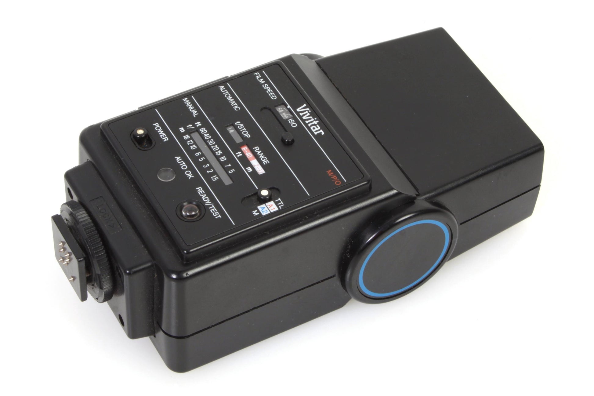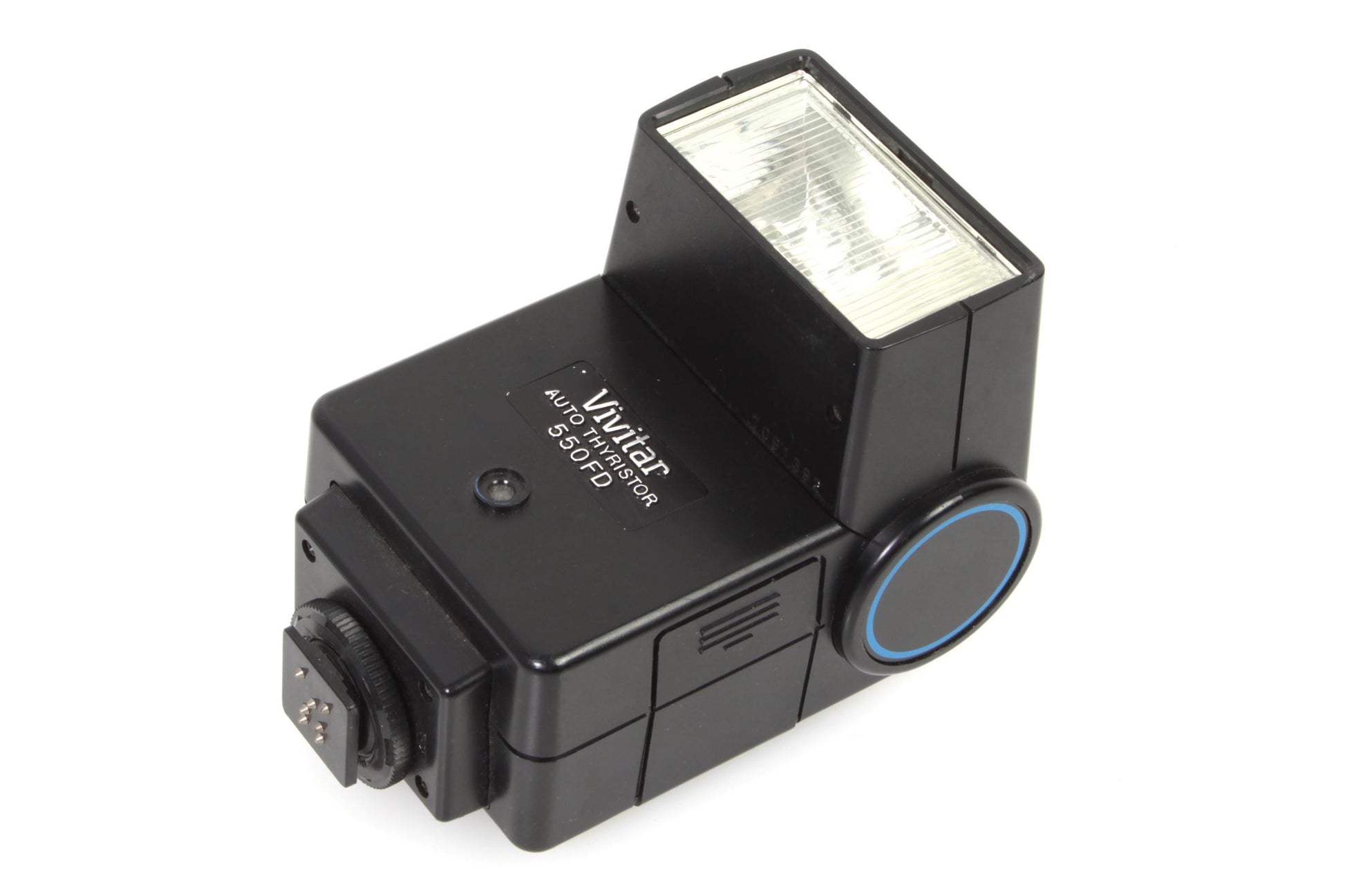 Vivitar Auto Thyristor 550FD flash. In working order, although it has not been tested for accuracy. Cosmetically it is in good vintage condition with some minor scratches and scuffs. The battery compartment is clean and free of corrosion. Takes 4 AA batteries (not included).
