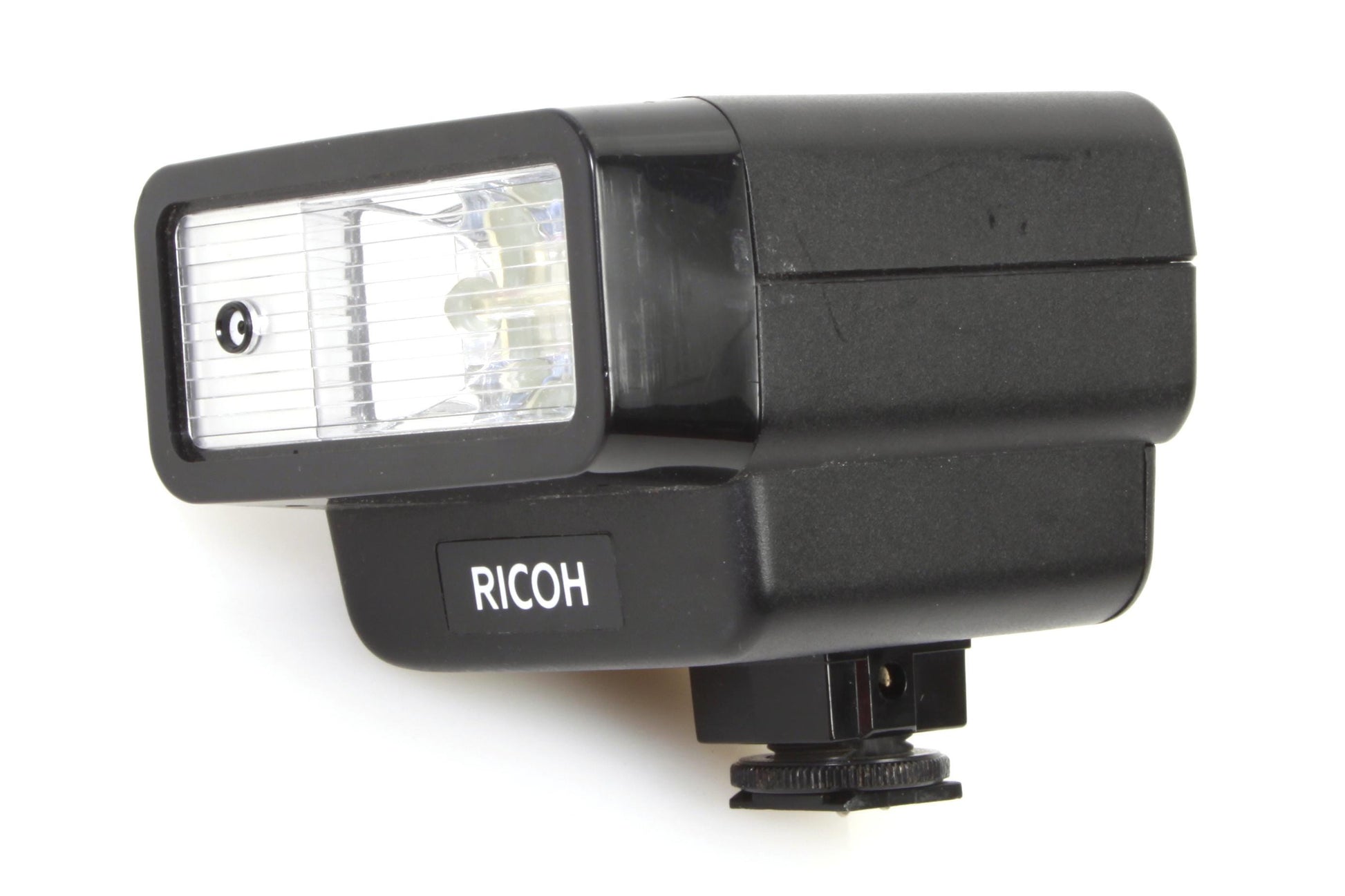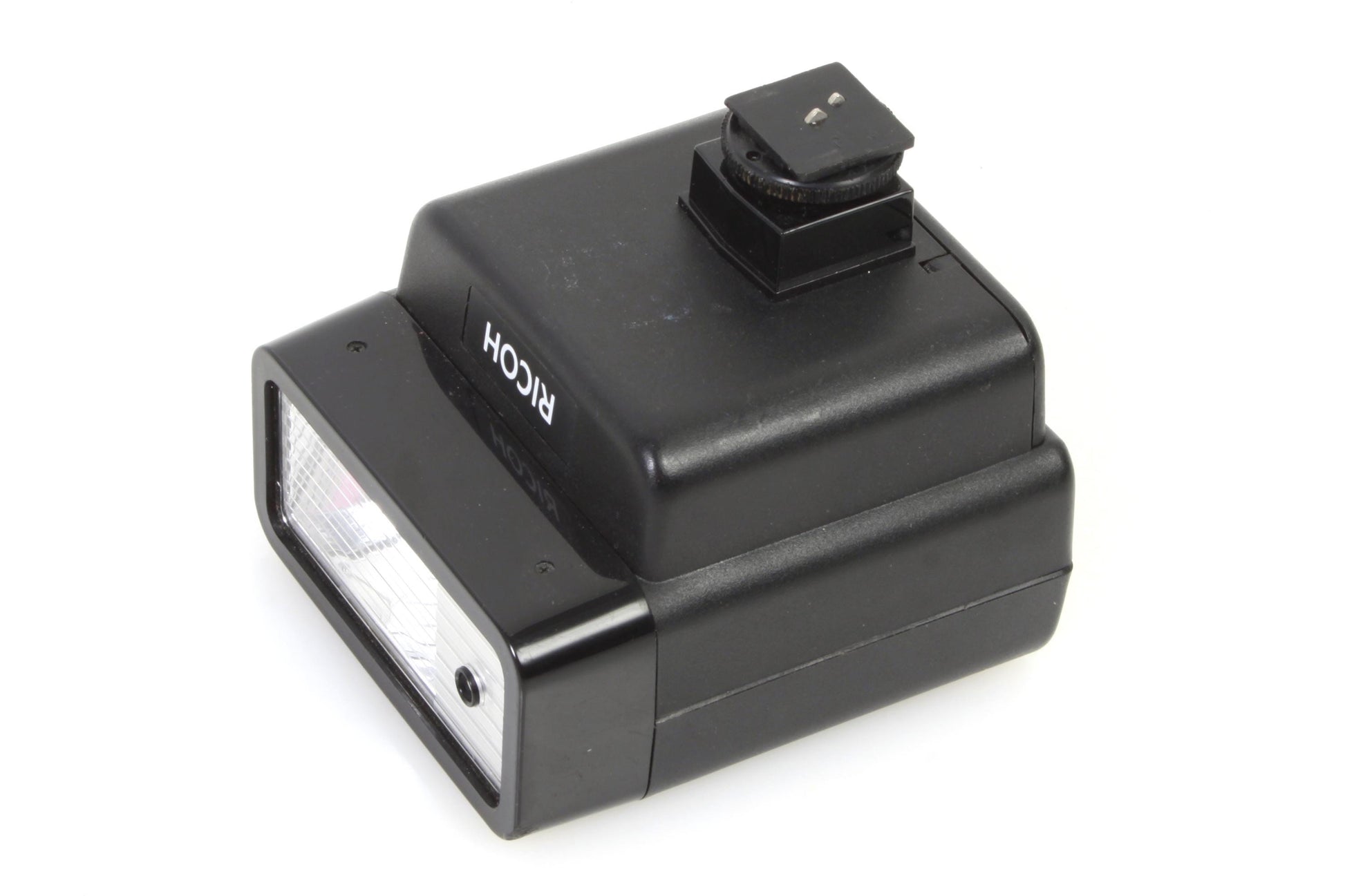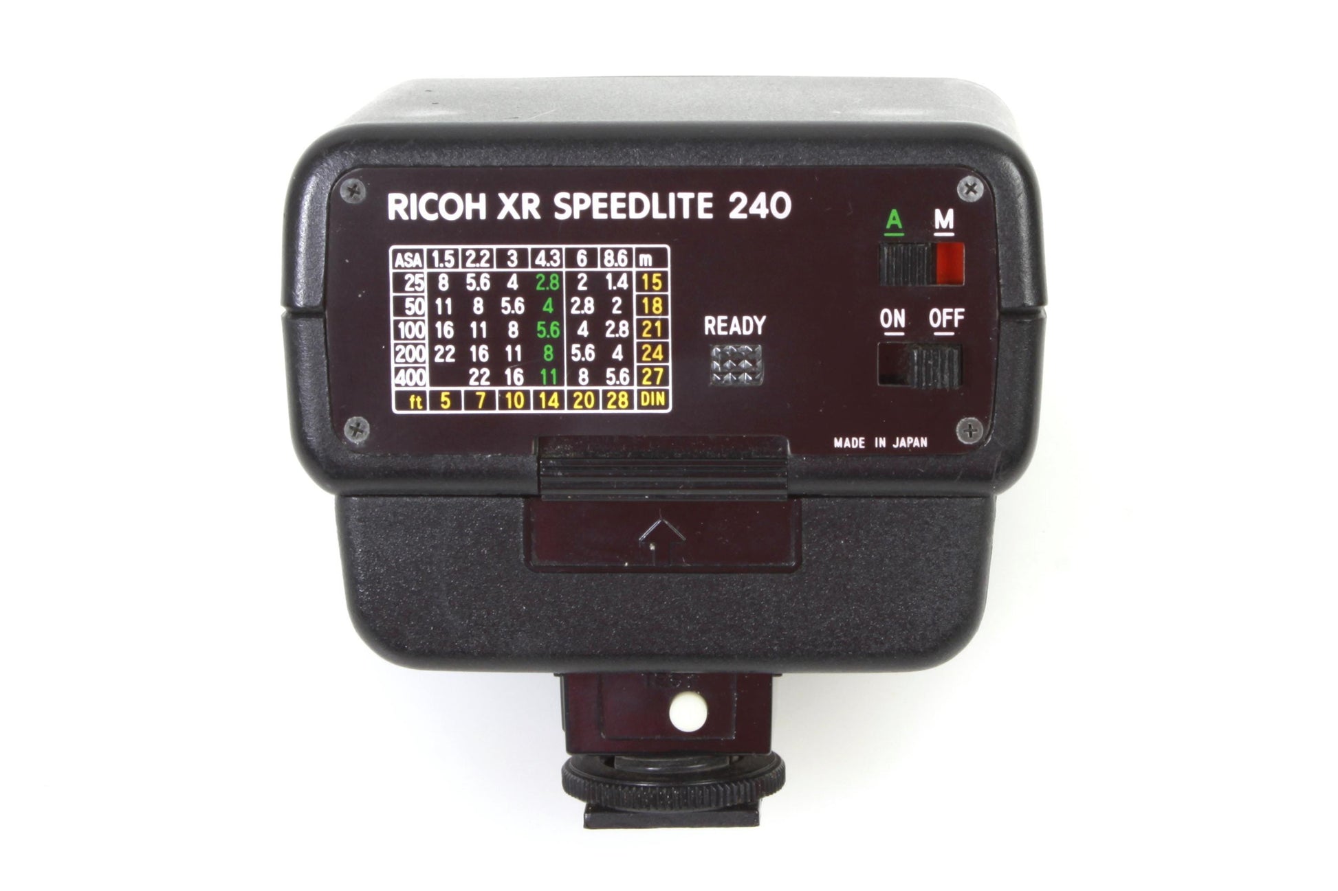 Ricoh XR Speedlite 240 flash. In working order, although it has not been tested for accuracy. Cosmetically it is in good vintage condition with some minor scratches and scuffs. The battery compartment is clean and free of corrosion. Takes 4 AA batteries (not included).