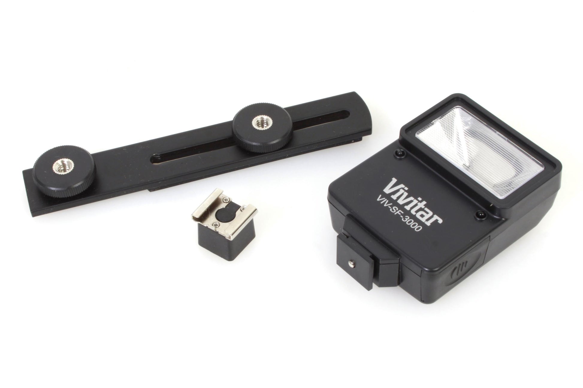 Vivitar VIV-SF-3000 Digital Slave Flash plus Bracket. In working order, although it has not been tested for accuracy. Cosmetically it is in very good vintage condition with some light scratches and scuffs. The battery compartment is clean and free of corrosion. Takes 2 AA batteries (not included). Comes with its original box and instructions.