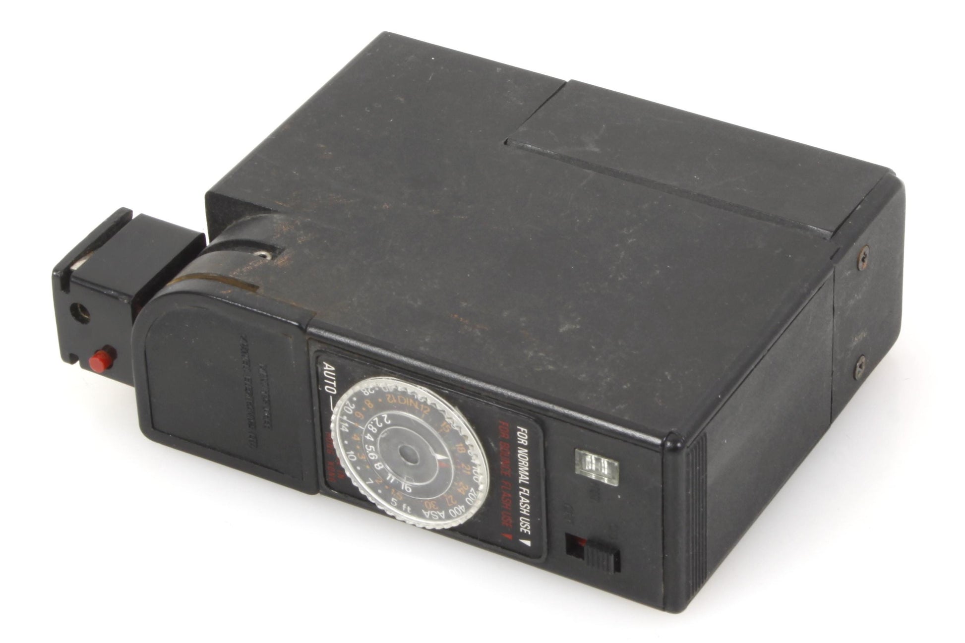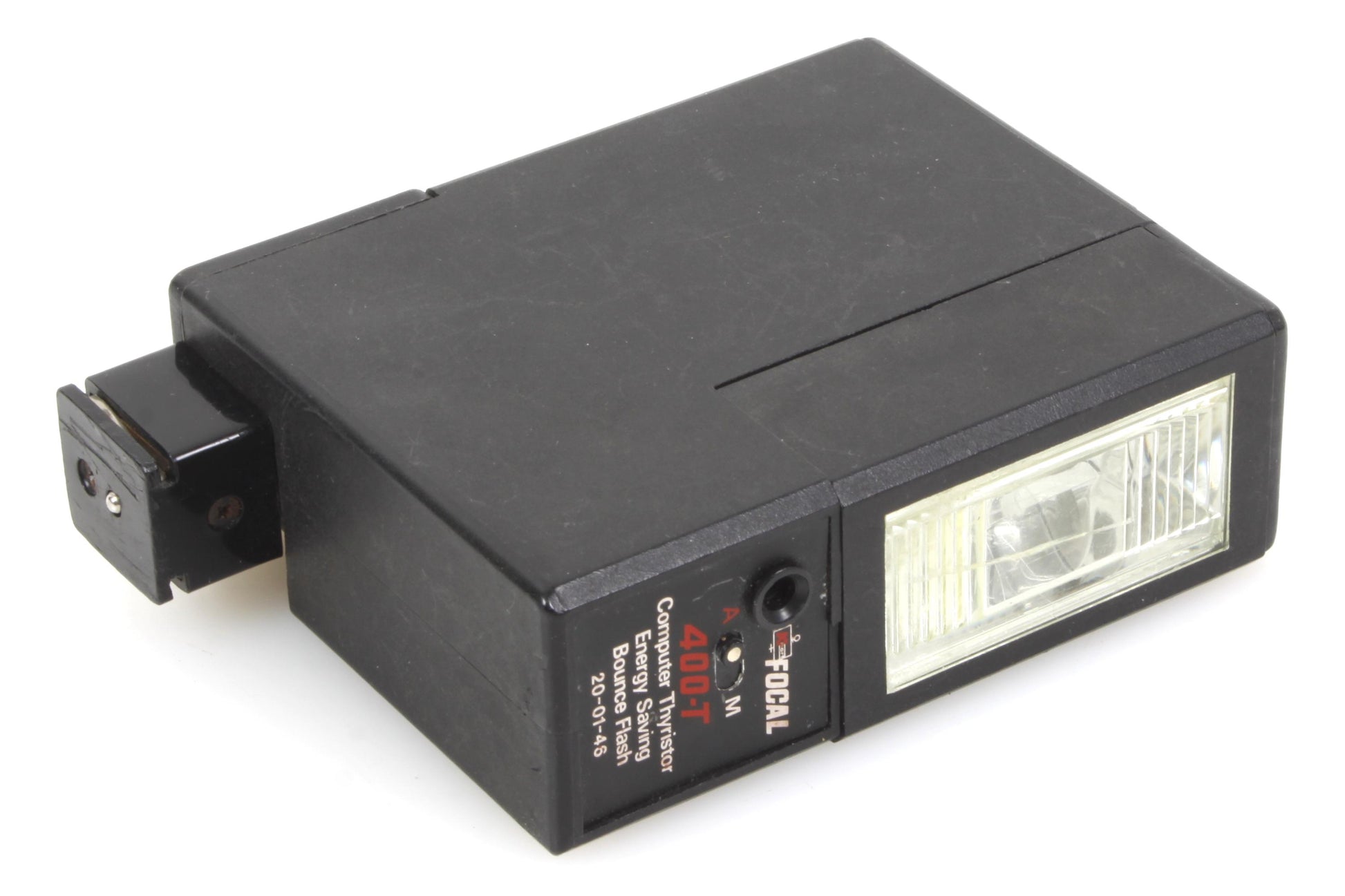 Focal 400-T flash with swivel function. In working order, although it has not been tested for accuracy. Cosmetically it is in good vintage condition with some light scratches and general signs of use. The battery compartment is clean and free of corrosion.