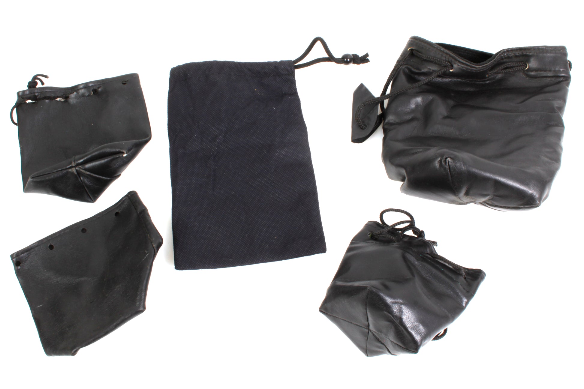 Set of five black lens cases. Approximate measurements: one 7.5 x 4.5 inches, one 3.5 x 2 x 2 inches, two 4.5 x 2 x 2 inches and one 7 x 3 x 3 inches. In good vintage condition with some wear and general signs of use. One is missing the drawstring.