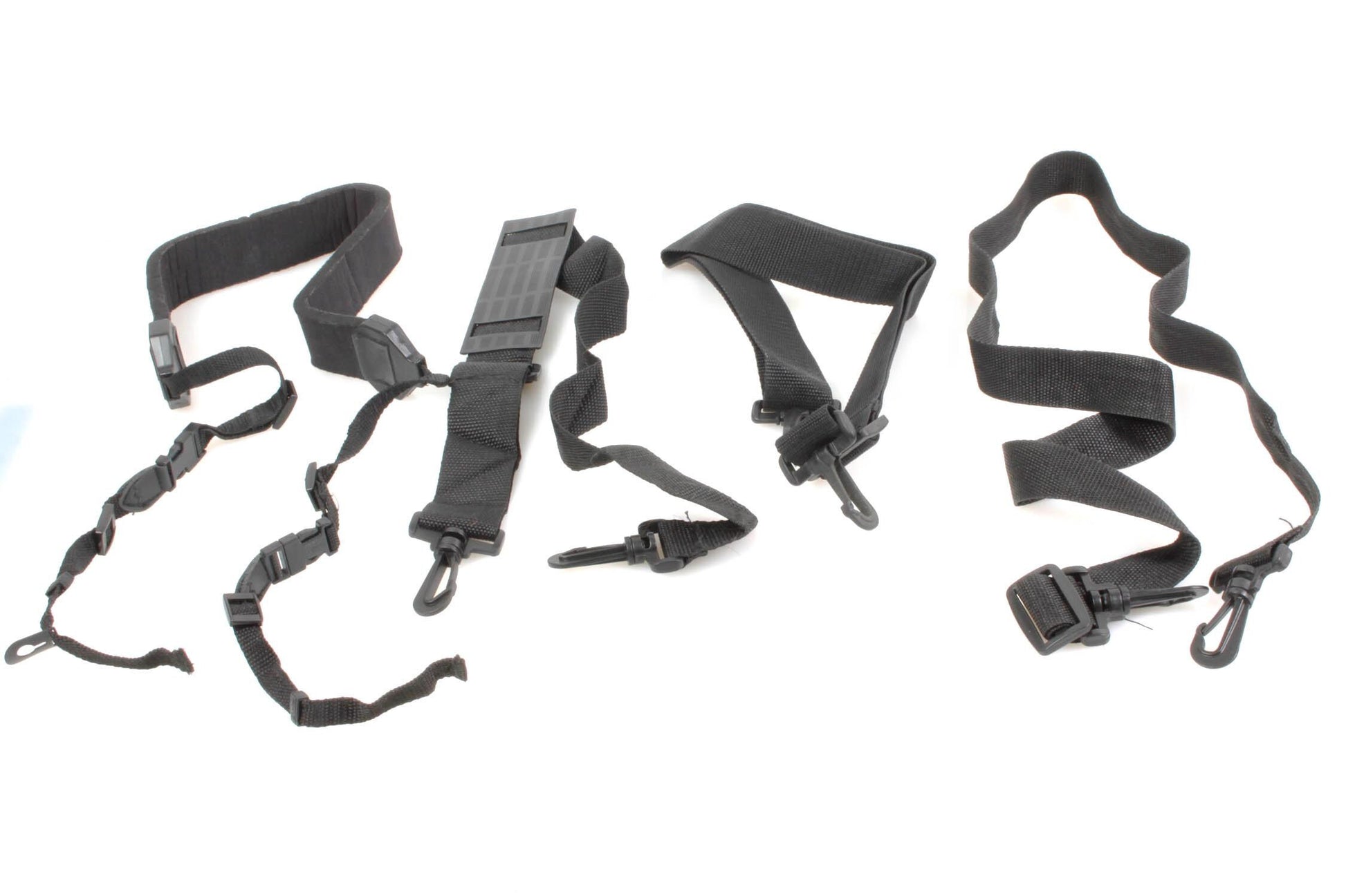 Various Black camera straps. Three of them have plastic clips with the last strap having a cutout connector piece. All straps are of average length and in good condition.