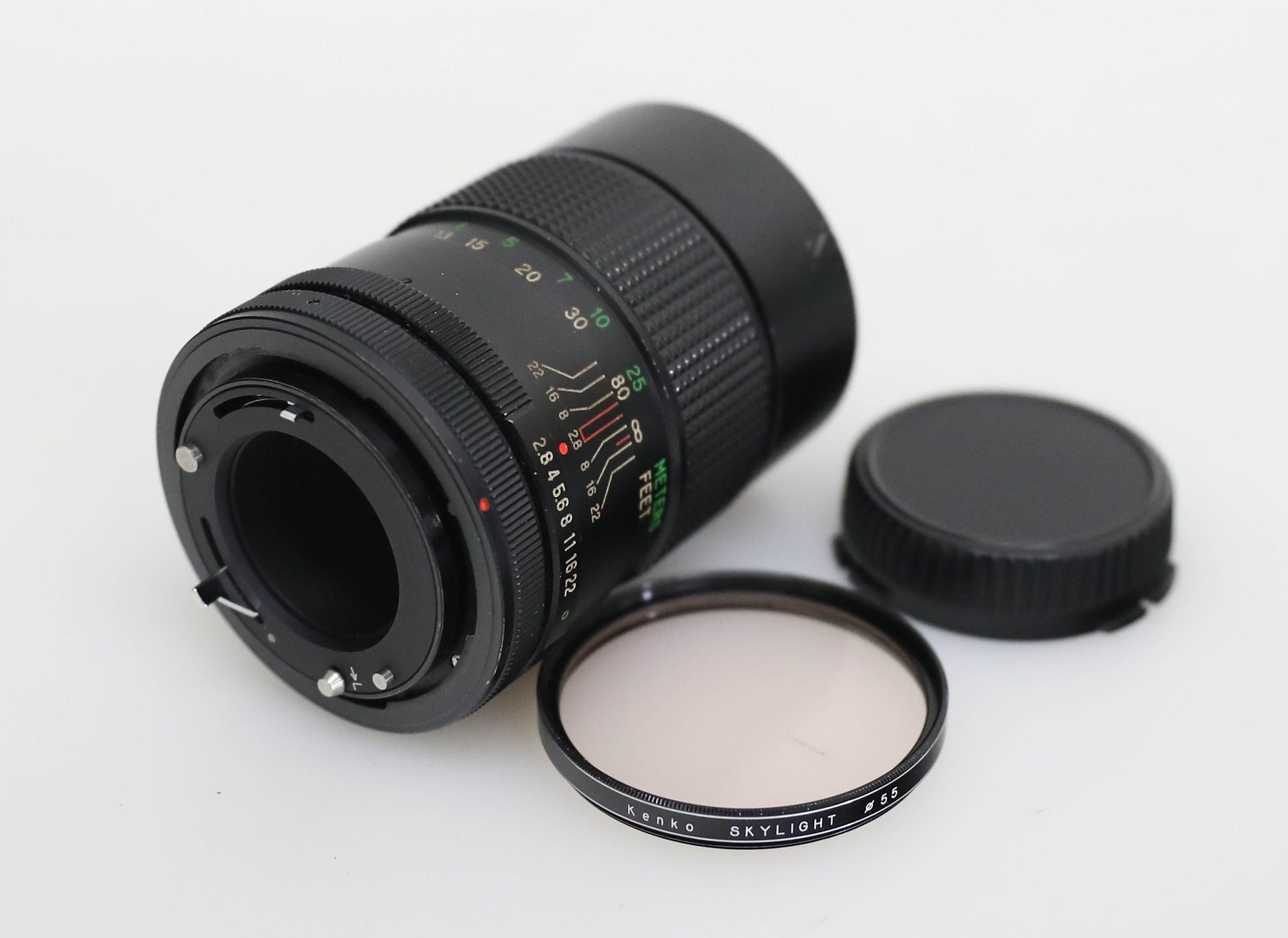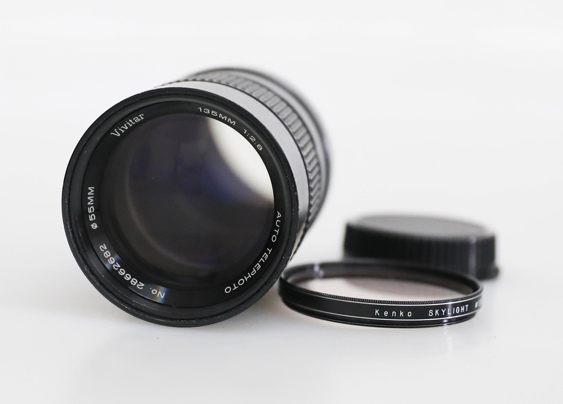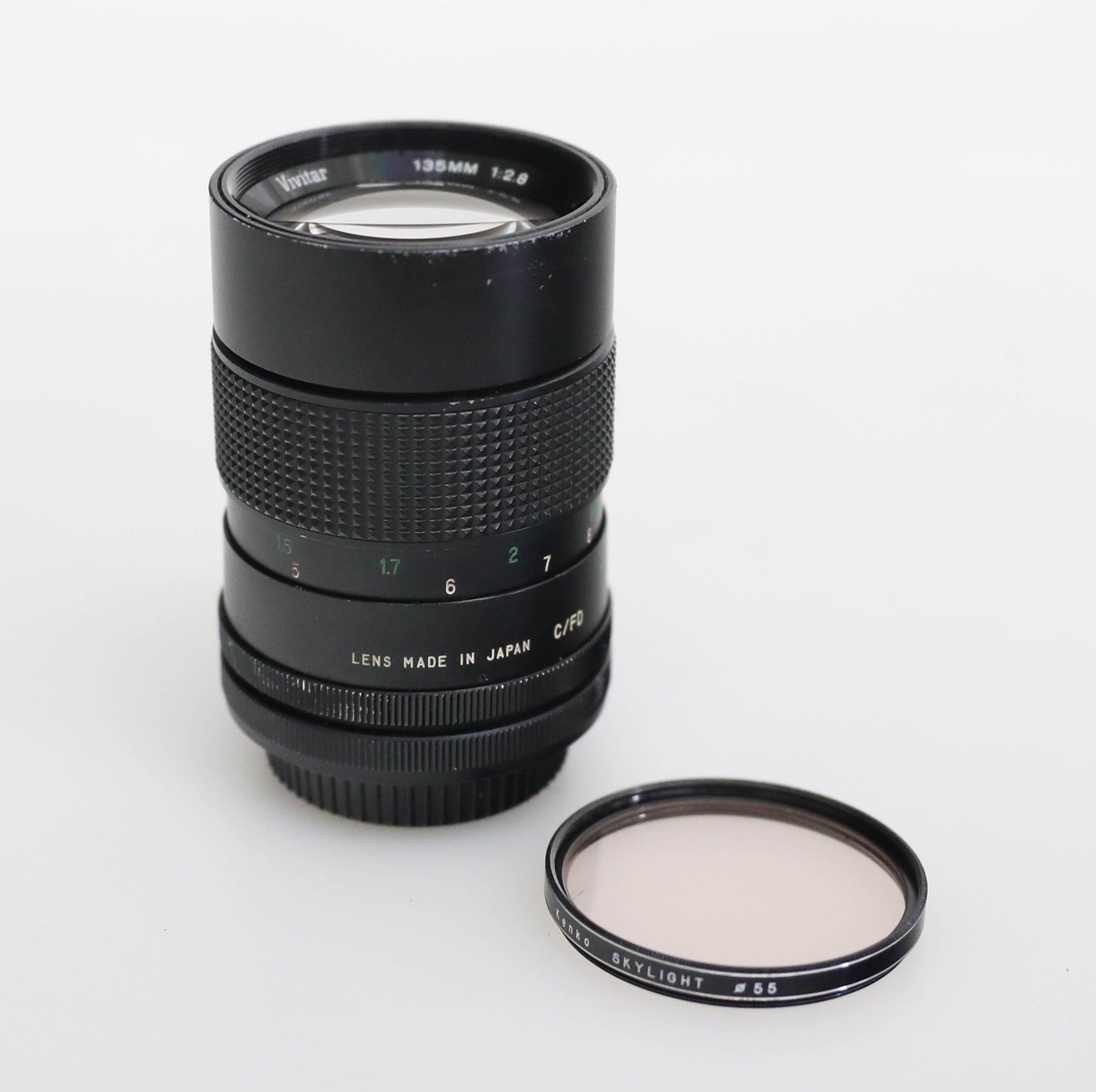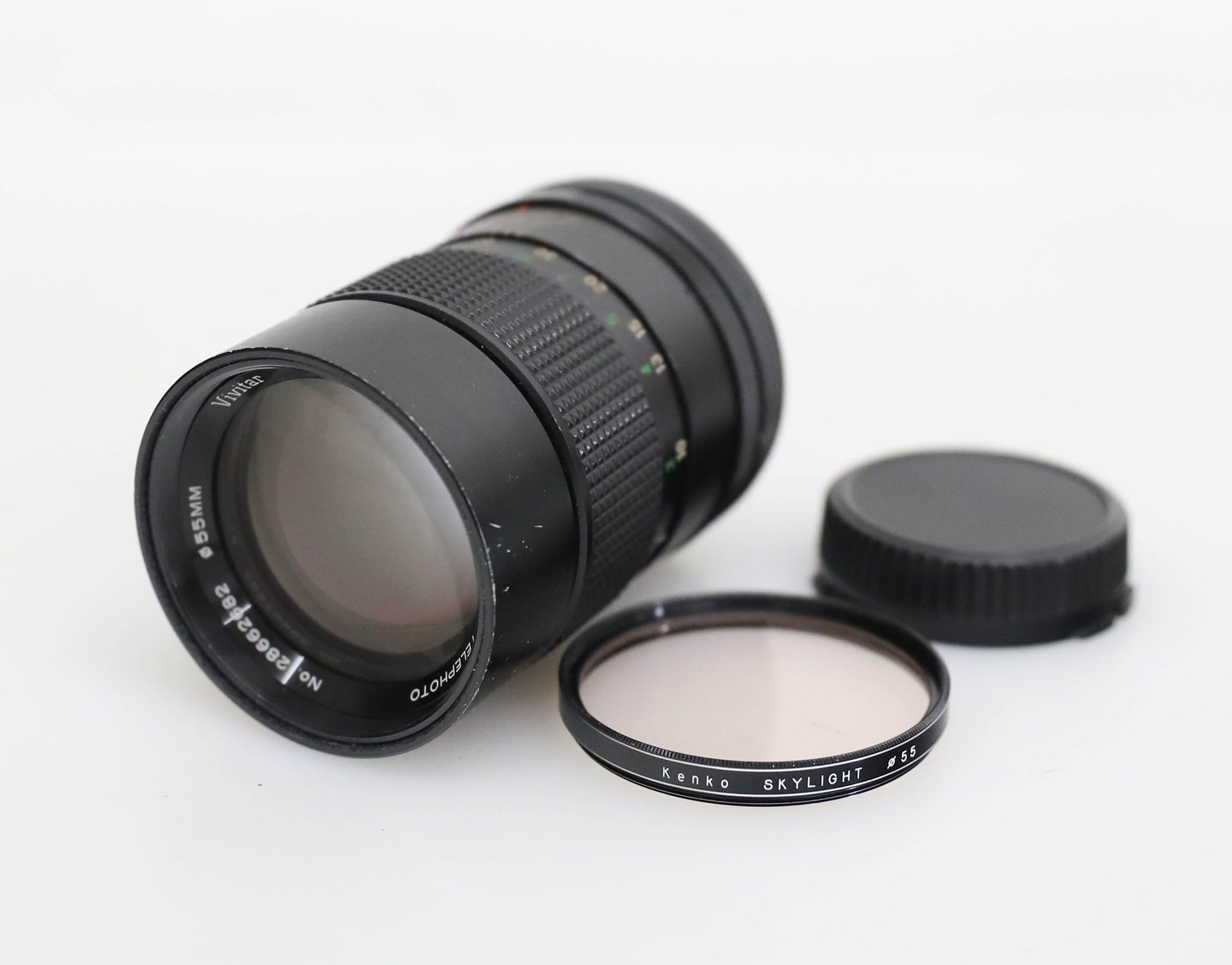 Good condition, has some wear including light surface scratches on lens body. Lens glass has no scratches, dust, fungus, or haze. Blades move smoothly. Filter thread has no dents. Comes with Kenko UV Skylight 55mm filter, good condition but does have some slight separation of filter coating. Lens has retractable hood attached. Comes with rear lens cap only, no front lens cap. Not tested on a camera, sold as is.