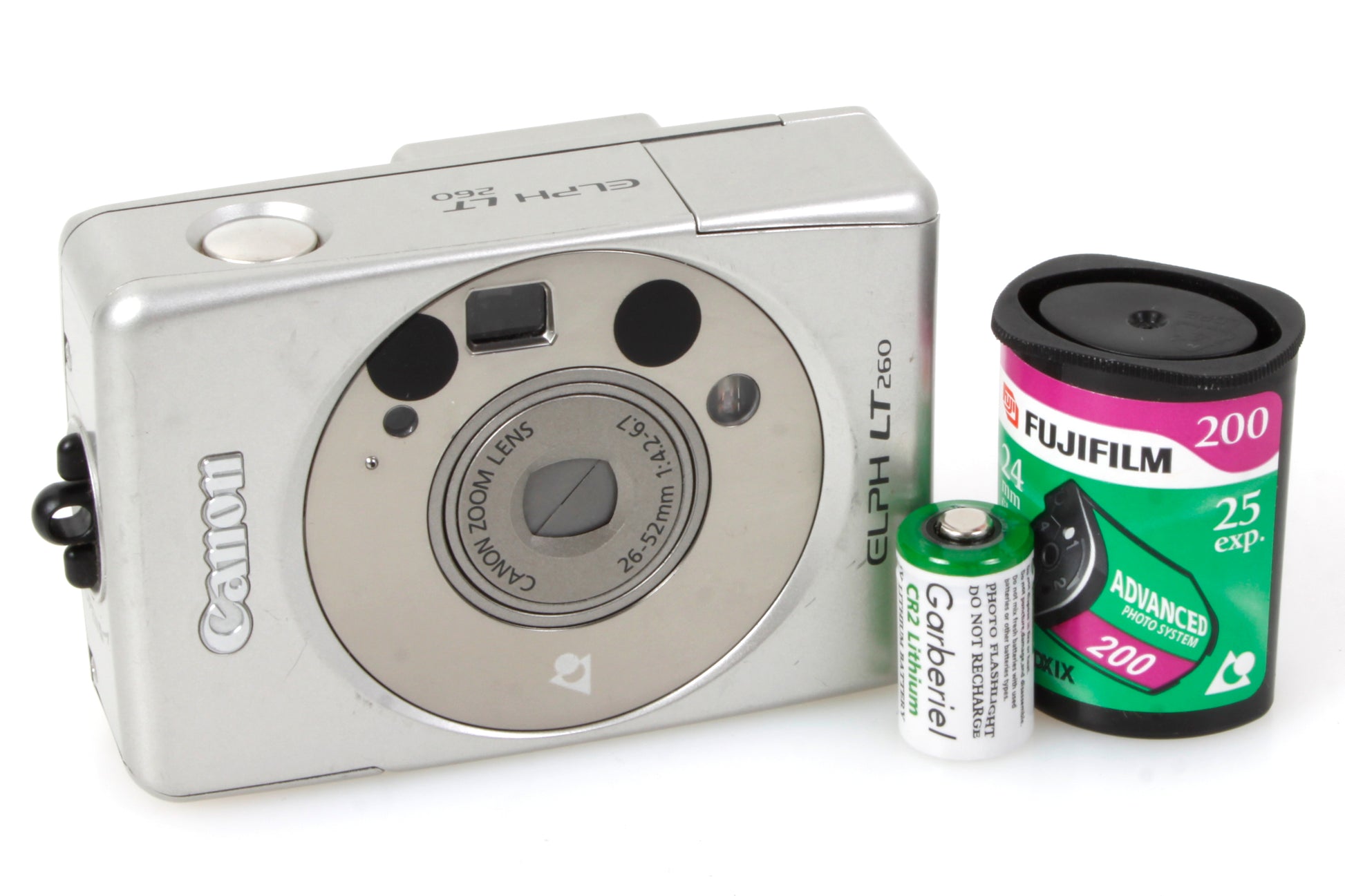 Canon Elph LT260 camera. In working order, although it has not been tested with film or for accuracy. Cosmetically it is in good vintage condition with some scratches and scuffs. The viewfinder is clear of haze and cracks. Comes with one roll of APS film and one new CR2 battery.