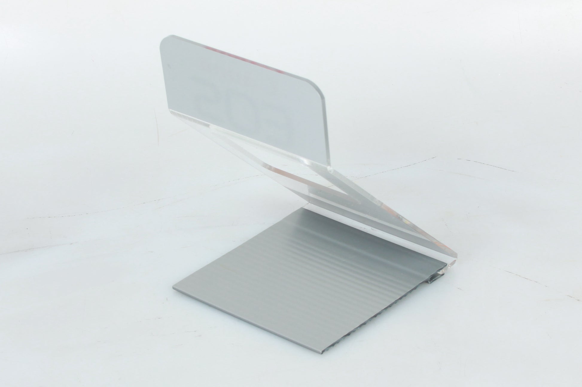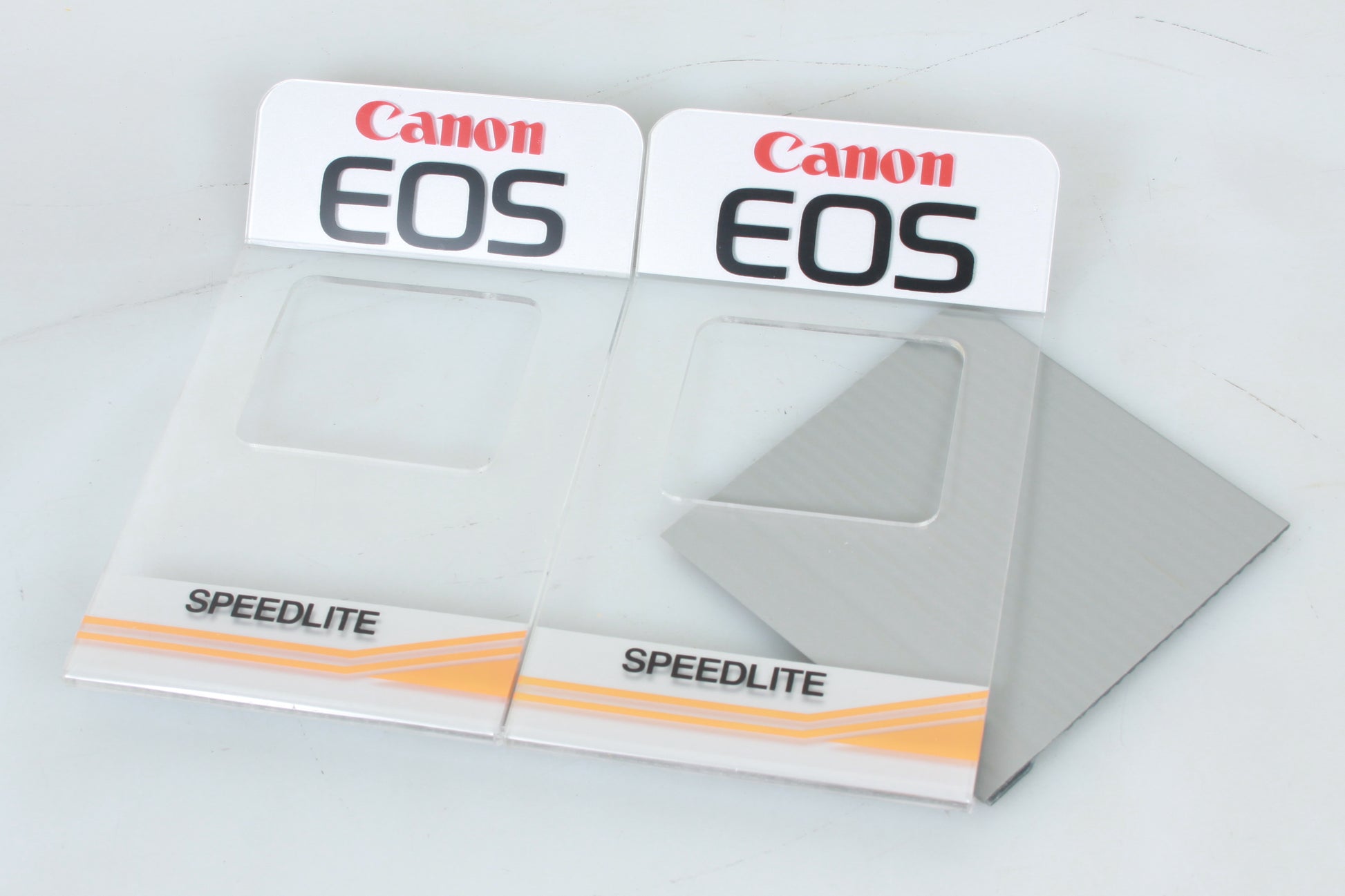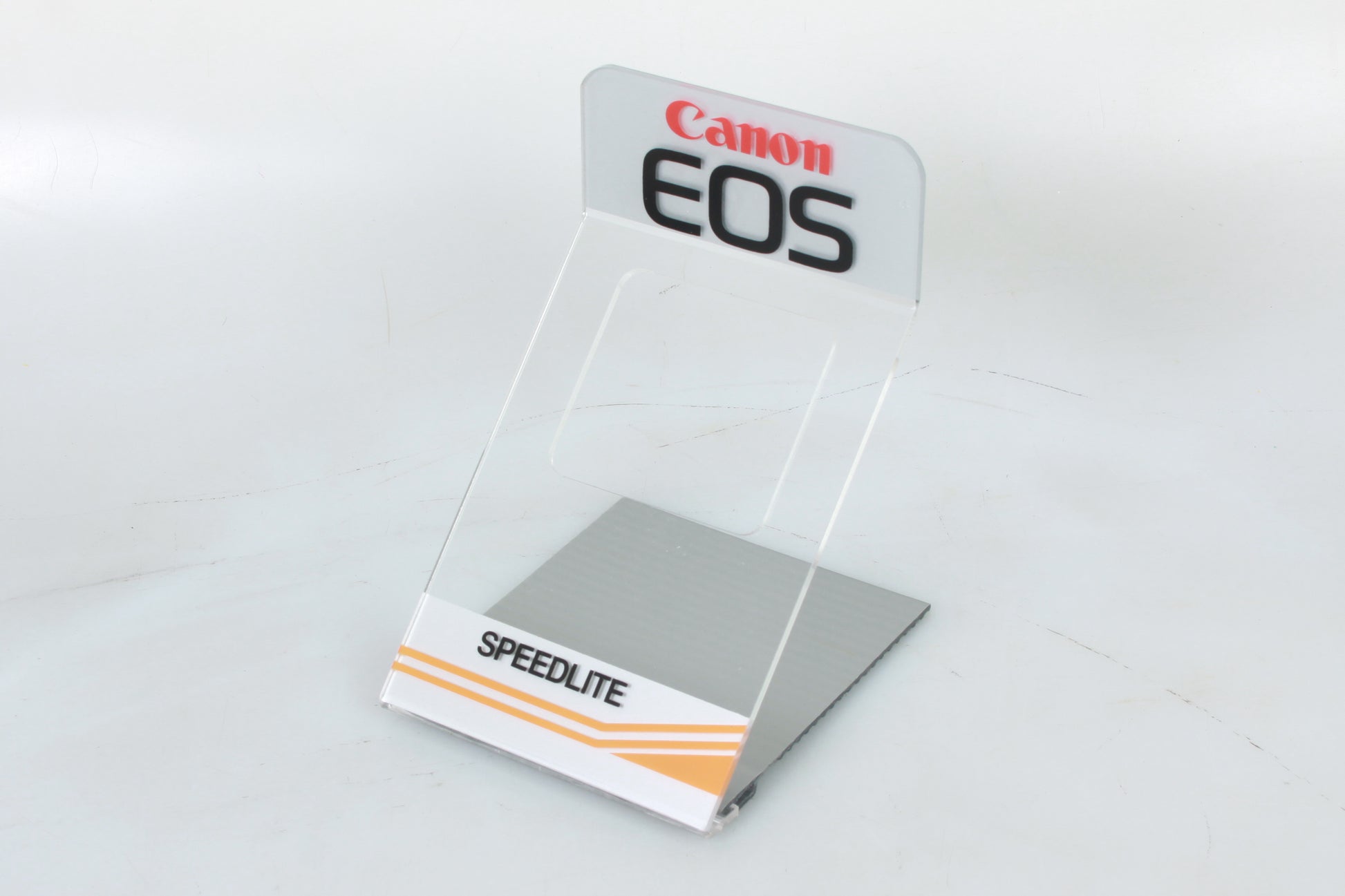 SET OF TWO CANON EOS SPEEDLITE STANDS. CLEAR PLASTIC WITH BRANDING. EACH MEASURES APPROXIMATELY 6 1/2 INCHES TALL X 4 11/16 INCHES WIDE X 5 1/4 INCHES DEEP. IN LIKE NEW CONDITION EXCEPT THAT ONE IS MISSING THE BASE PART.