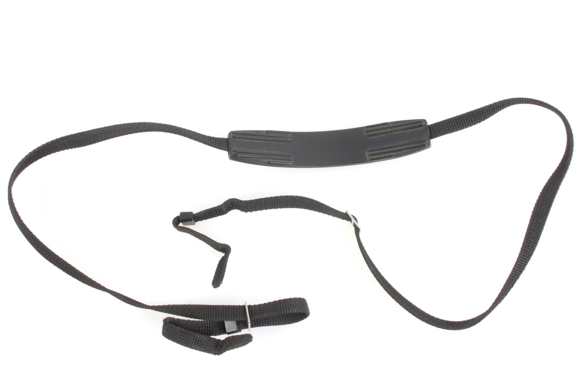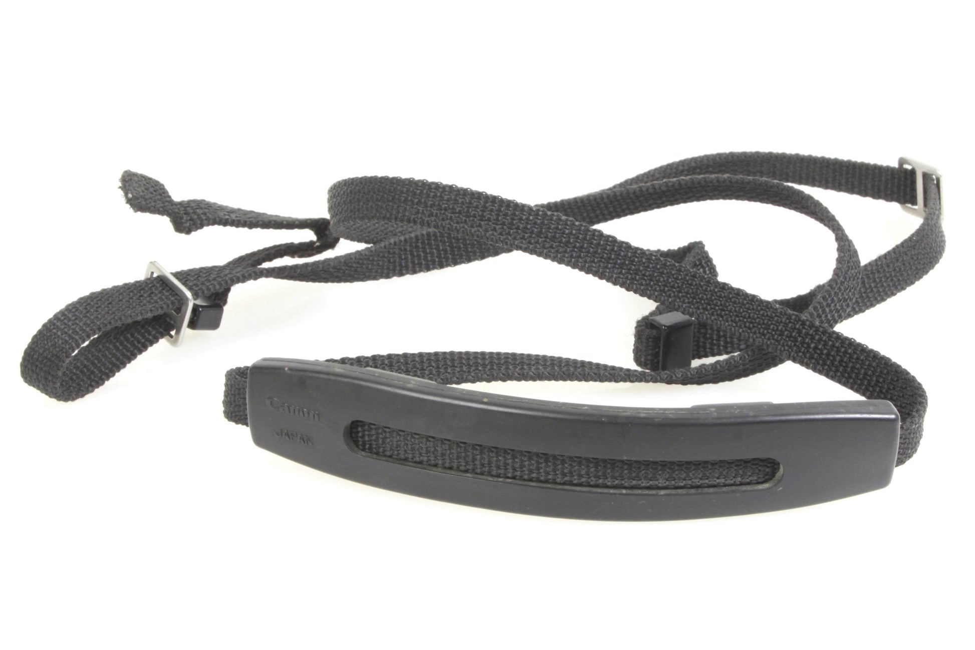 Canon black camera strap with rubber neck pad. Strap measures approximately 3/8 inch wide x 45 inches long. In very good vintage condition with some general signs of use.