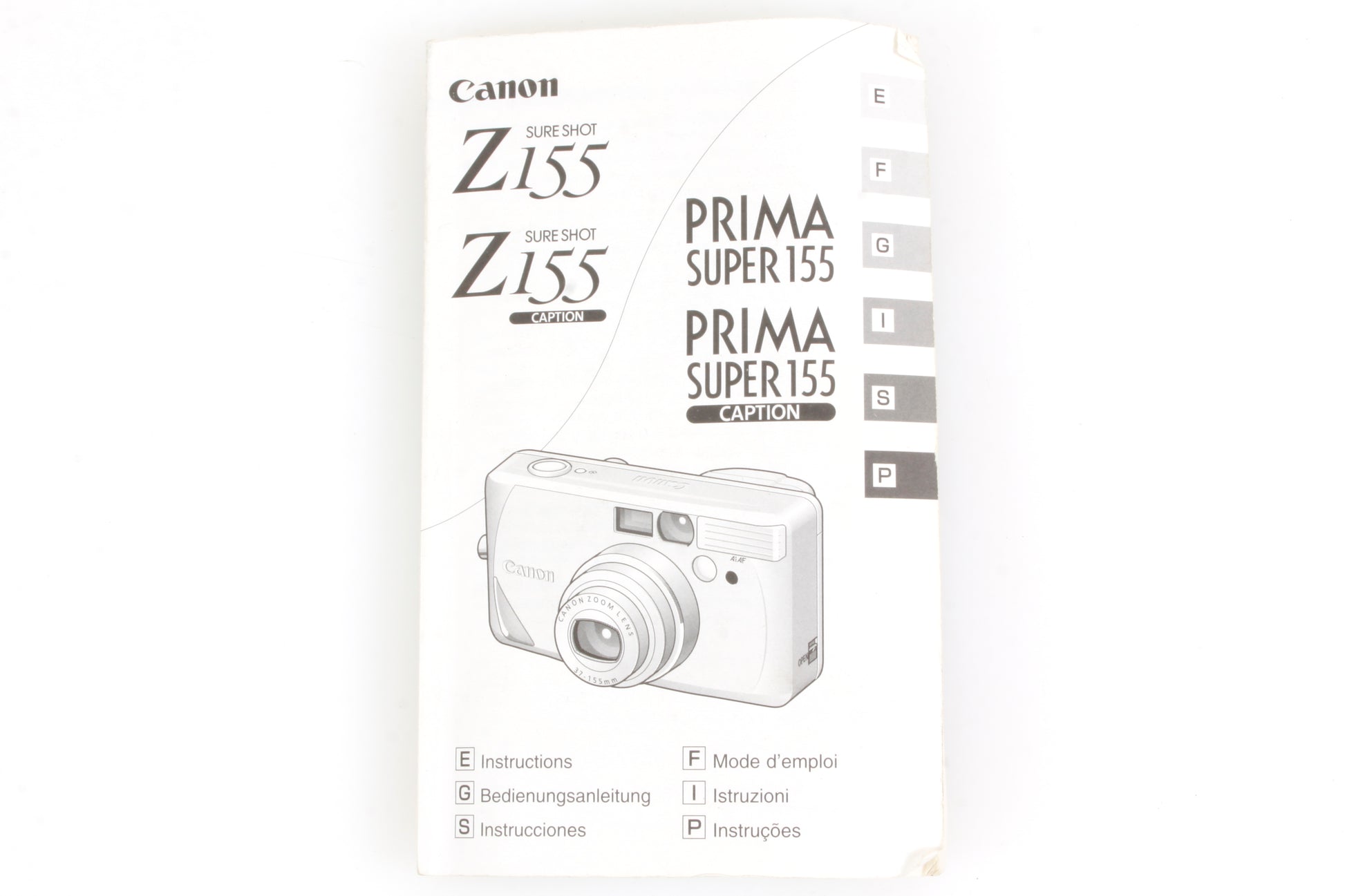 Canon Sure Shot Z155 / Prima Super 155 Instruction Manual. In English, German, Spanish, French, Italian and Portuguese languages. In good vintage condition. There is some creasing and light wear but the contents are still readable.