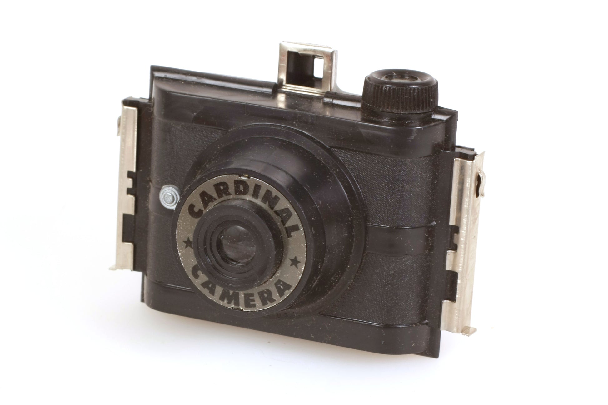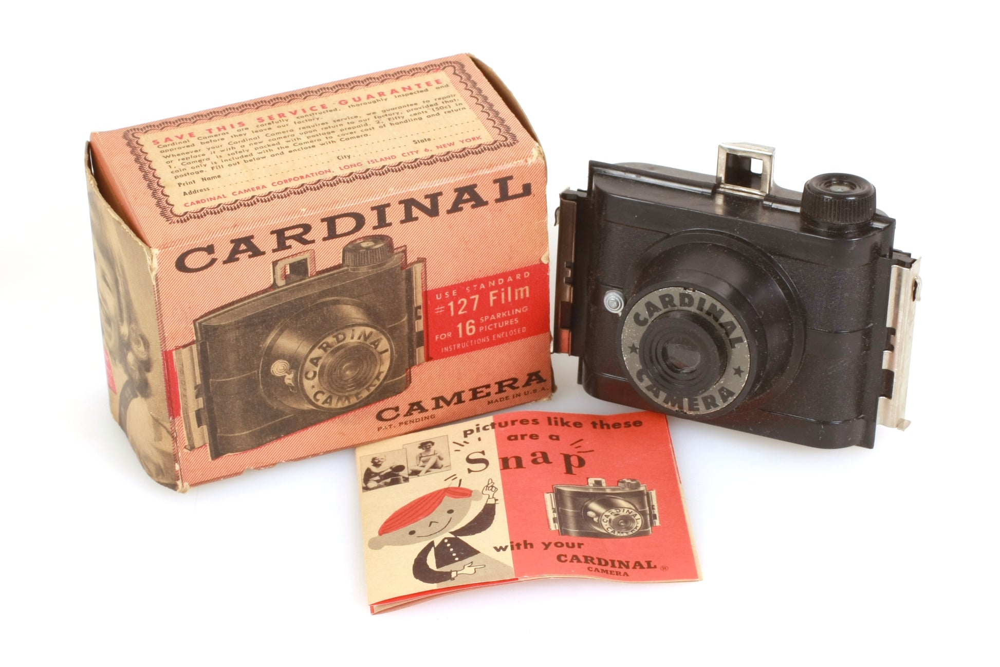 VINTAGE CARDINAL CAMERA. TAKES 127 FILM (NOT INCLUDED). THE SHUTTER FIRES BUT IT DOES SEEM TO STICK A LITTLE OCCASIONALLY. IT HAS NOT BEEN TESTED WITH FILM OR FOR ACCURACY. COSMETICALLY IT IS IN VERY GOOD CONDITION. COMES WITH ORIGINAL BOX AND INSTRUCTIONS. THERE IS SOME DAMAGE TO THE BOX.
