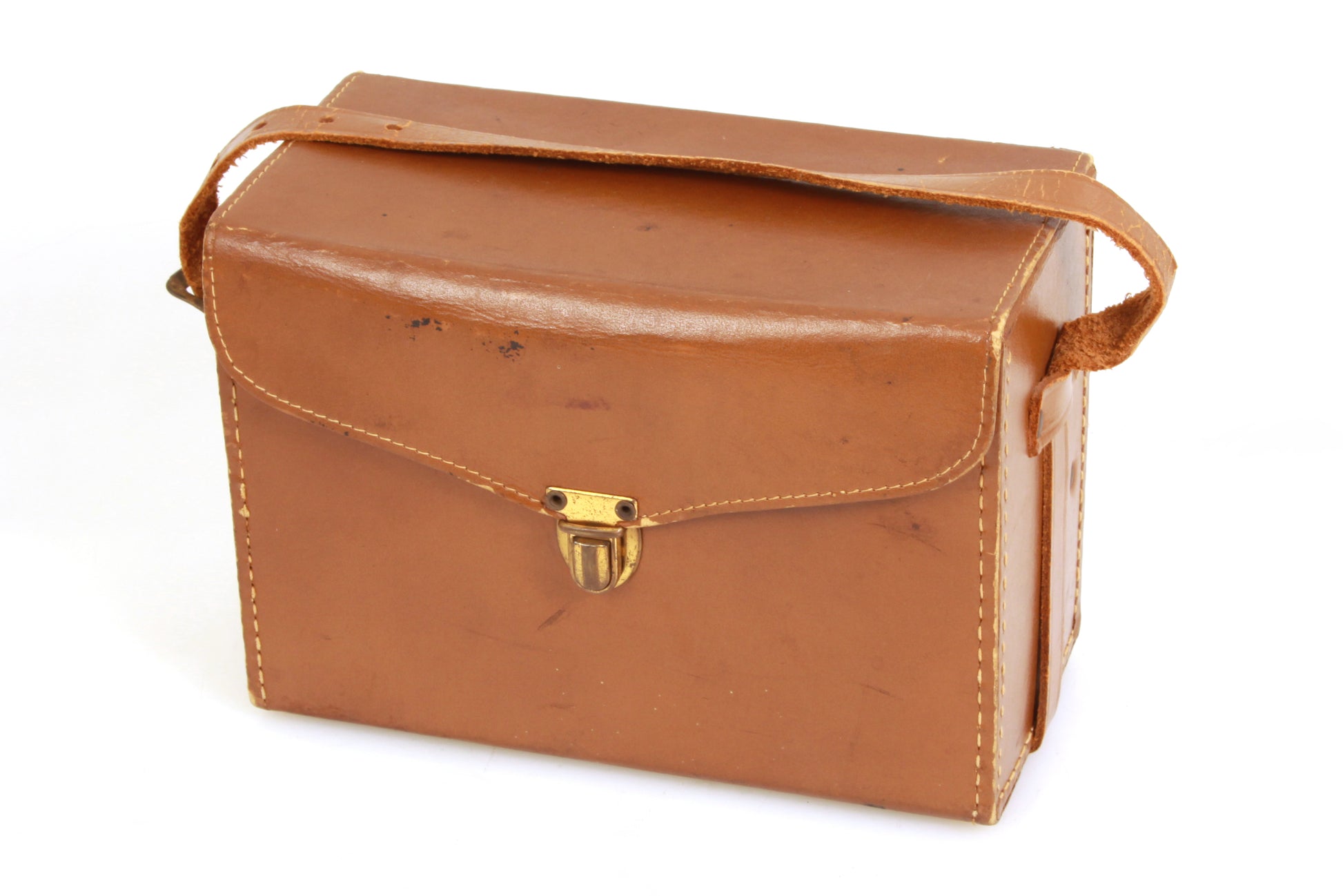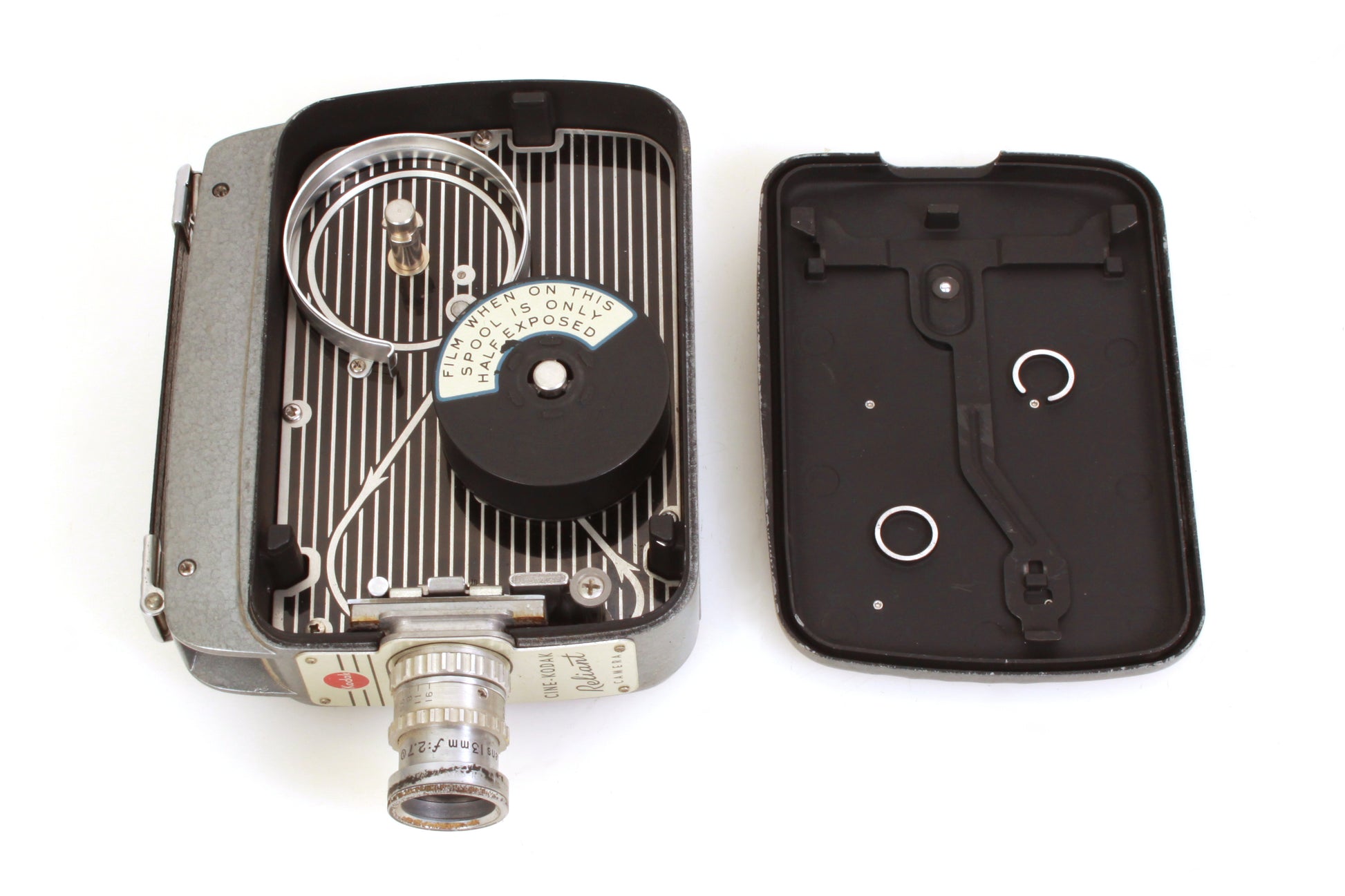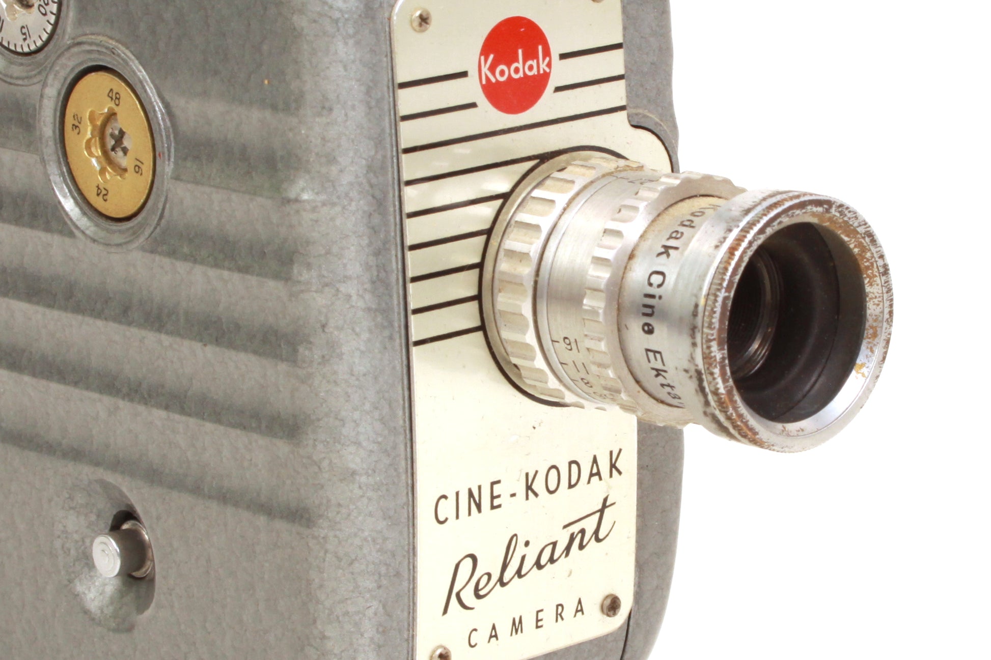 CINE-KODAK RELIANT CAMERA WITH 13MM F:2.7 LENS. IT LOOKS TO BE IN WORKING ORDER - THE MOTOR IS WORKING, ALTHOUGH IT HAS NOT BEEN TESTED WITH FILM OR FOR ACCURACY. SOLD AS IS - FOR PROP OR DISPLAY. THE BODY IS IN GOOD VINTAGE CONDITION WITH SOME SCRATCHES AND GENERAL SIGNS OF AGE AND USE. THERE IS SOME DUST AND HAZE PRESENT TO THE LENS BUT NO SCRATCHES. SOME MARKS AND RUST TO THE ADAPTER RING AND RETAINING RING. SOME DUST AND HAZE PRESENT TO THE VIEWFINDER BUT NO CRACKS. COMES WITH MANUAL AND BROWN LEATHER CASE. THE CASE IS BROWN LEATHER AND THE OVERALL MEASUREMENTS ARE APPROXIMATELY 8 3/16 X 6 X 4 INCHES. THERE IS SOME WEAR AND TEAR, AND SOME MARKS TO THE CASE. THERE IS SOME WEAR AND CREASING TO THE MANUAL, AND SOME HANDWRITING TO THE INSIDE COVER BUT THE CONTENTS ARE STILL CLEAN AND READABLE.