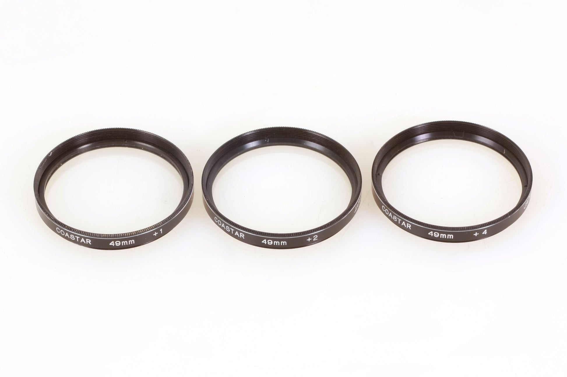 COASTAR SET OF THREE 49MM CLOSE-UP LENSES: +1, +2 AND +4. COMES IN BLACK CASE WHICH MEASURES APPROXIMATELY 2 5/8 X 2 1/2 X 1 1/8 INCHES. IN VERY GOOD USED CONDITION. LIGHT SIGNS OF USE.