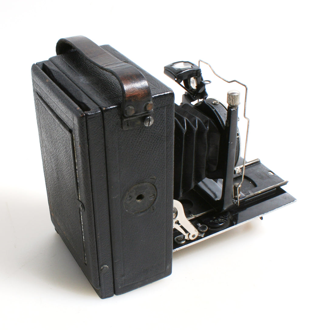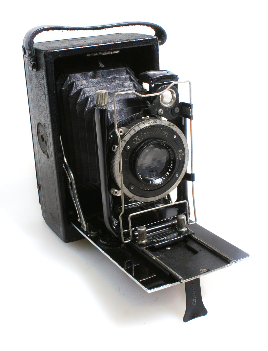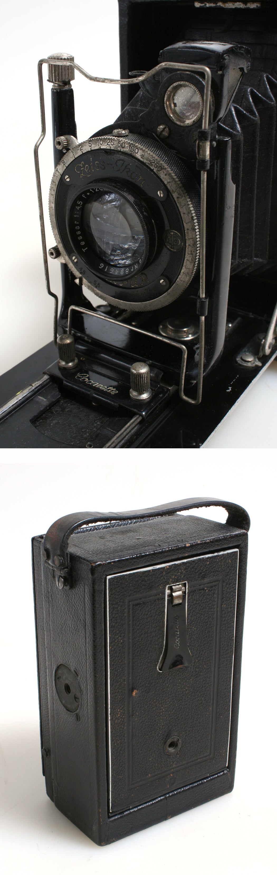 COCARETTE LUXUS. CARL ZEISS JENA NR. 1928. 6X9CM, 6.5X11CM AND 8X10.5 CM SIZES. BROWN LEATHER COVERING, POLISHED METAL PARTS. DOUBLE EXTENSION. DIAL SET COMPUR. DOMINAR OR TESSAR F4.5. BELLOWS IN GOOD CONDITION. OPENS SMOOTHLY. HAS SOME SLIGHT WEAR AND TEAR ON OUTSIDE.