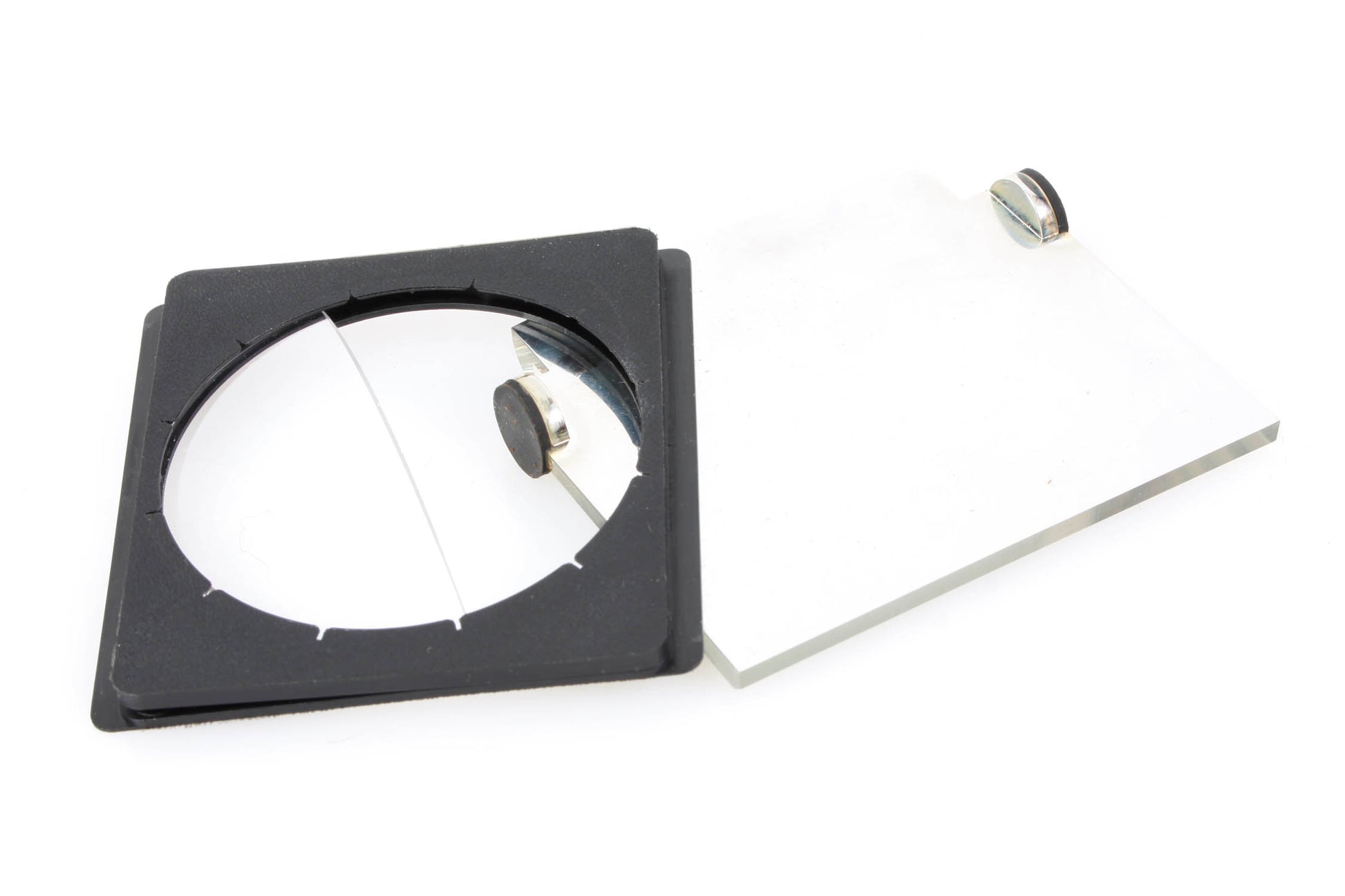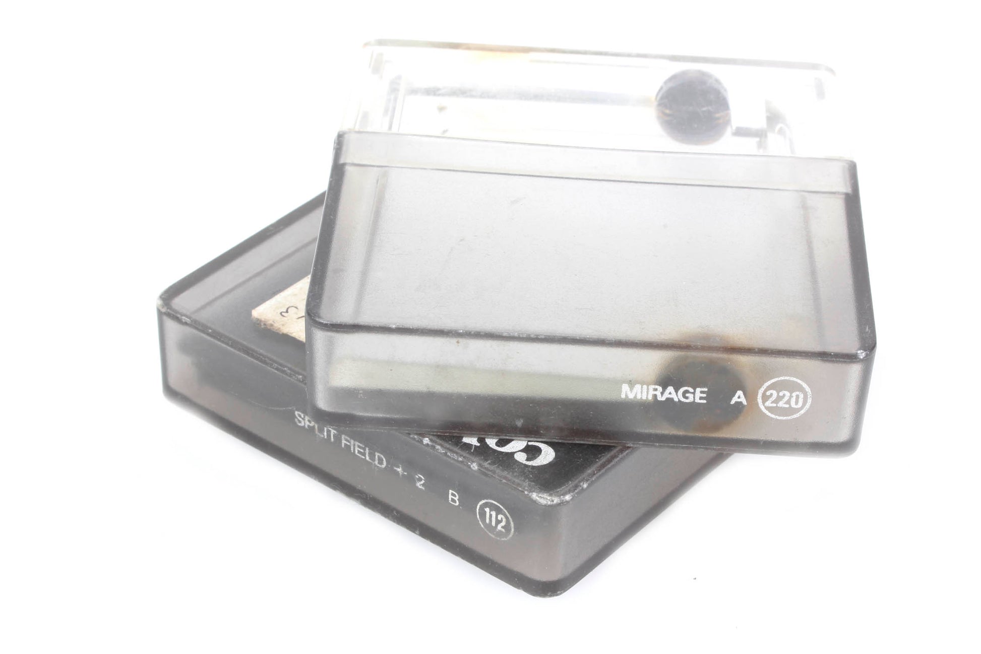 Filters in plastic cases. Split focus filter, glass is slightly loose and could be crocked if not corrected. Other is a mirage filter in good condition, needs cleaned.