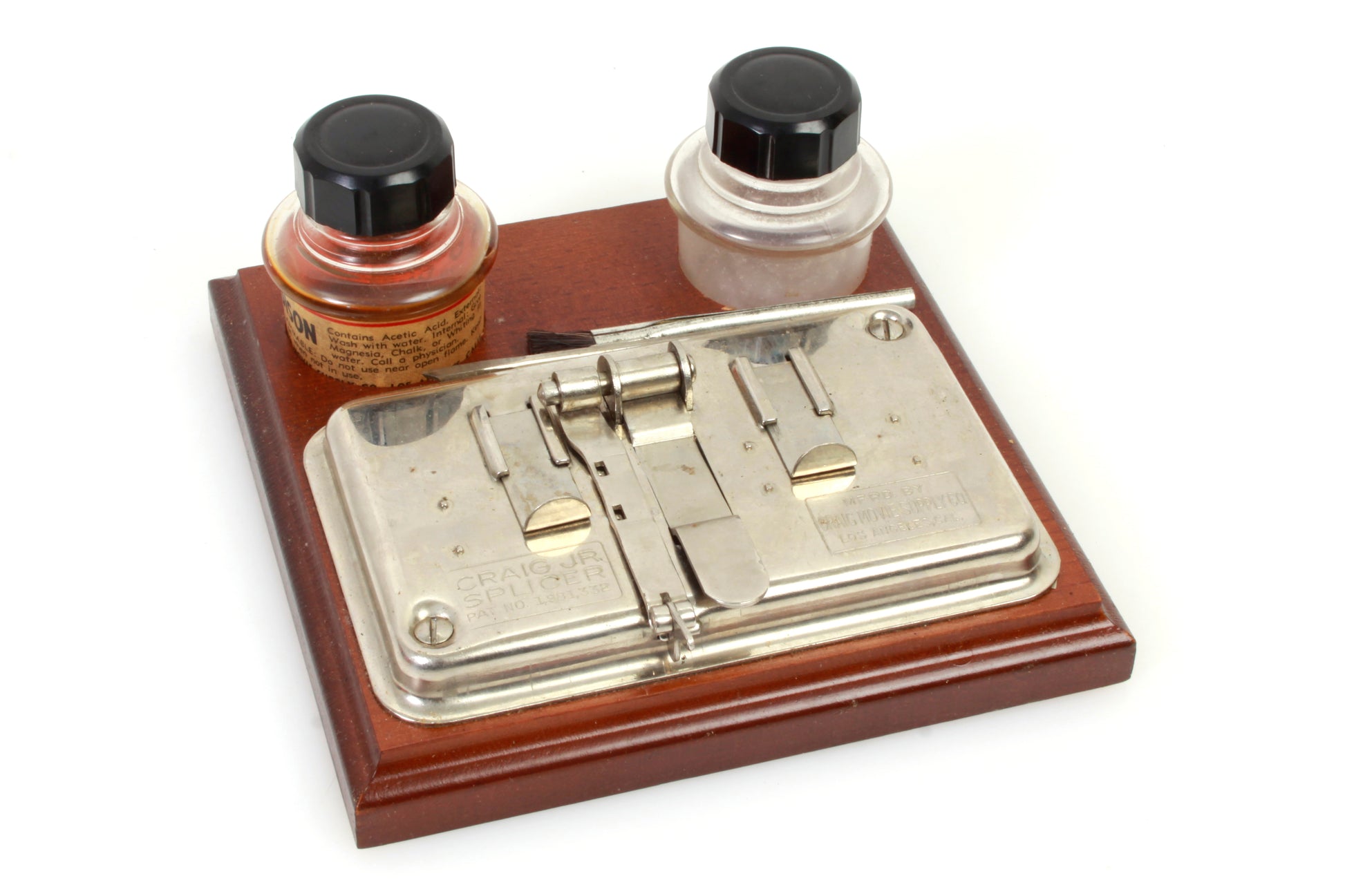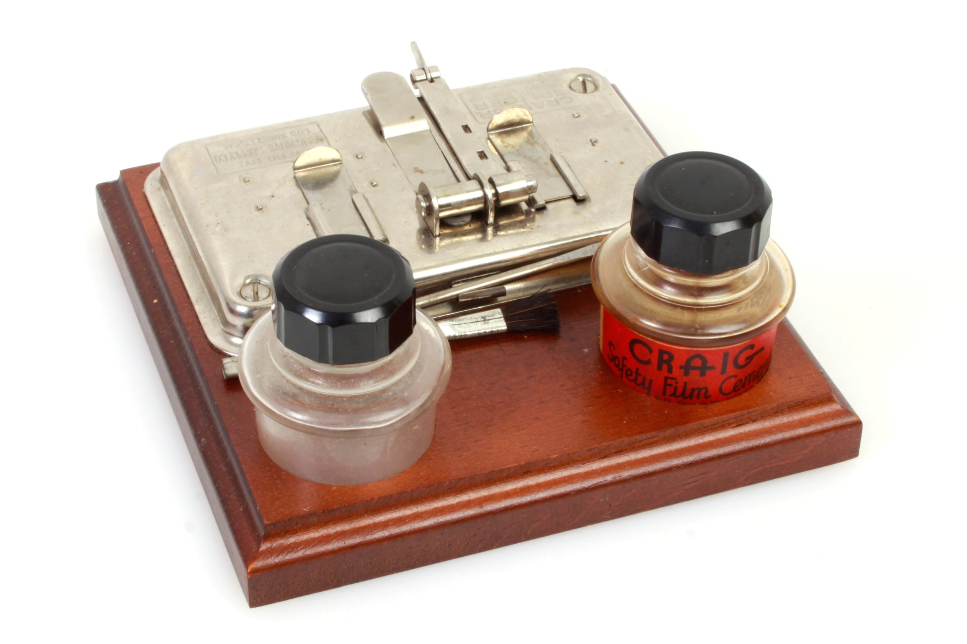 Craig 8-16mm Junior Splicer. This is a vintage item and there are some general signs of age and use. It has not been tested so it is sold as is. Comes with its original box, instructions, film cement, oil can and two empty bottles.