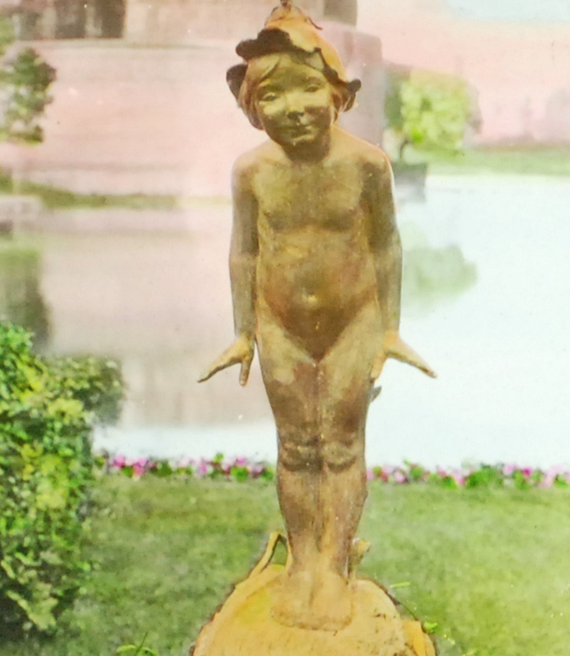 Cute Pixie Boy In Garden, Hand Tinted Antique Photo On Glass. IN VINTAGE CONDITION WITH NORMAL WEAR FROM AGE.