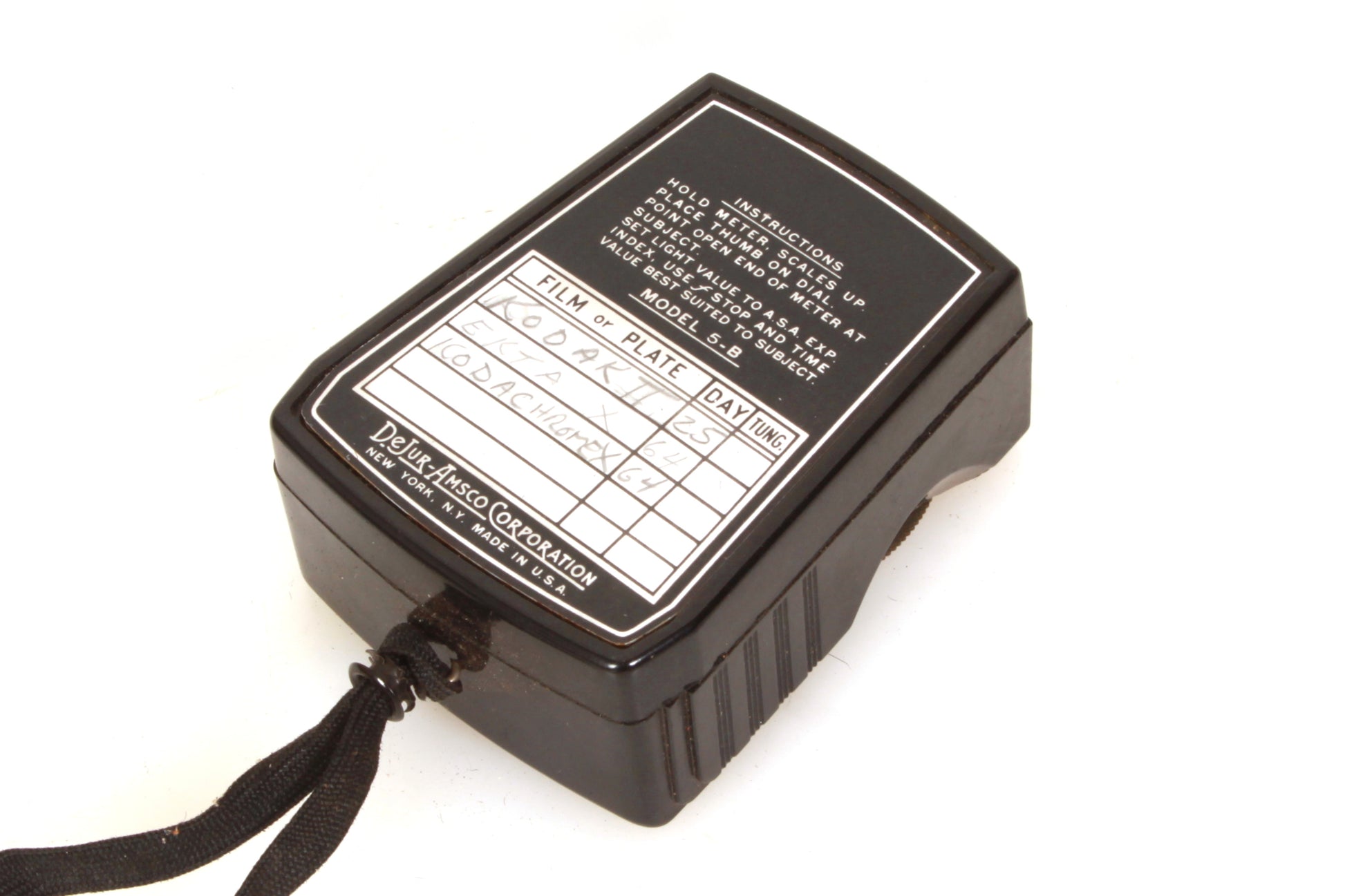 DeJur Model 5-B light meter. Sold as is - for prop or display. It does not seem to be working. Cosmetically it is in good vintage condition with some general signs of age and use. There is some handwriting to the back.