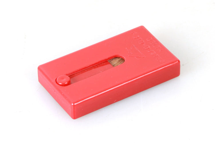 DELTA FOTO-DUSTER BRUSH. RED PLASTIC WITH CAMEL HAIR. OVERALL MEASUREMENTS 2 1/4 X 1 1/4 X 3/8 INCHES. IN GOOD VINTAGE CONDITION. SOME MARKS/SCRATCHES. OPENING THE BRUSH IS SMOOTH BUT RETRACTING IT IS A LITTLE STIFF.