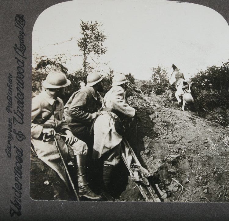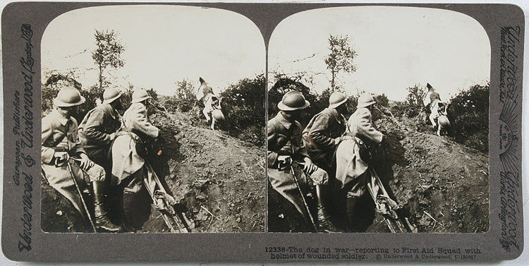 DOG IN WWI WITH HELMET, STEREOVIEW. UNDERWOOD AND UNDERWOOD BROTHERS STEREOVIEW CARD. CARD HAS SLIGHT CURVE. CARD HAS BLANK BACK. TEXT ON BOTTOM FRONT OF CARD READS THE DOG IN WAR REPORTING TO FIRST AID SQUAD WITH HELMET OF WOUNDED SOLDIER. SEE PHOTO FOR MORE COSMETIC / IMAGE DETAILS.