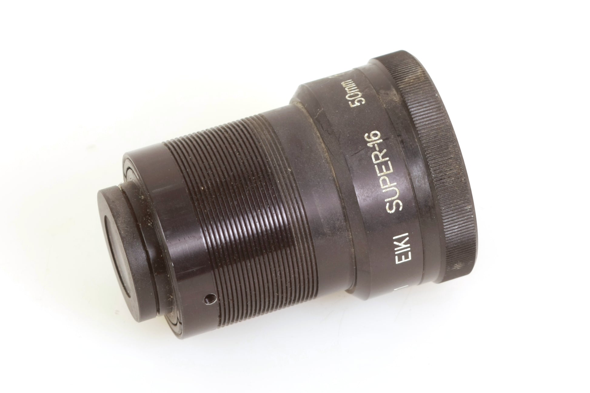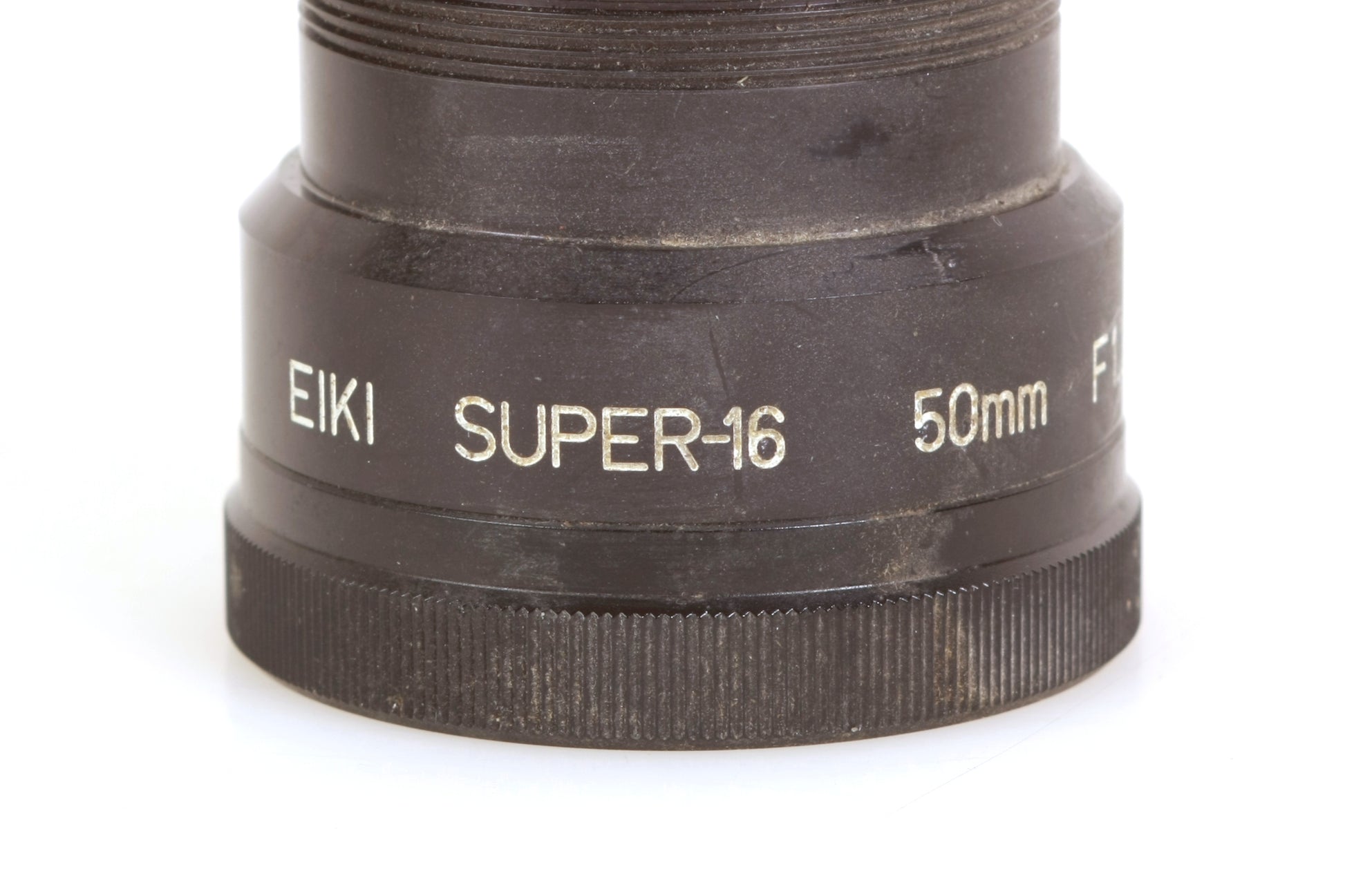EIKI SUPER-16 50MM F1.2 LENS. THERE IS SOME DUST AND HAZE PRESENT TO THE LENS BUT NO SCRATCHES. THE BARREL HAS SOME MARKS AND SCRATCHES.