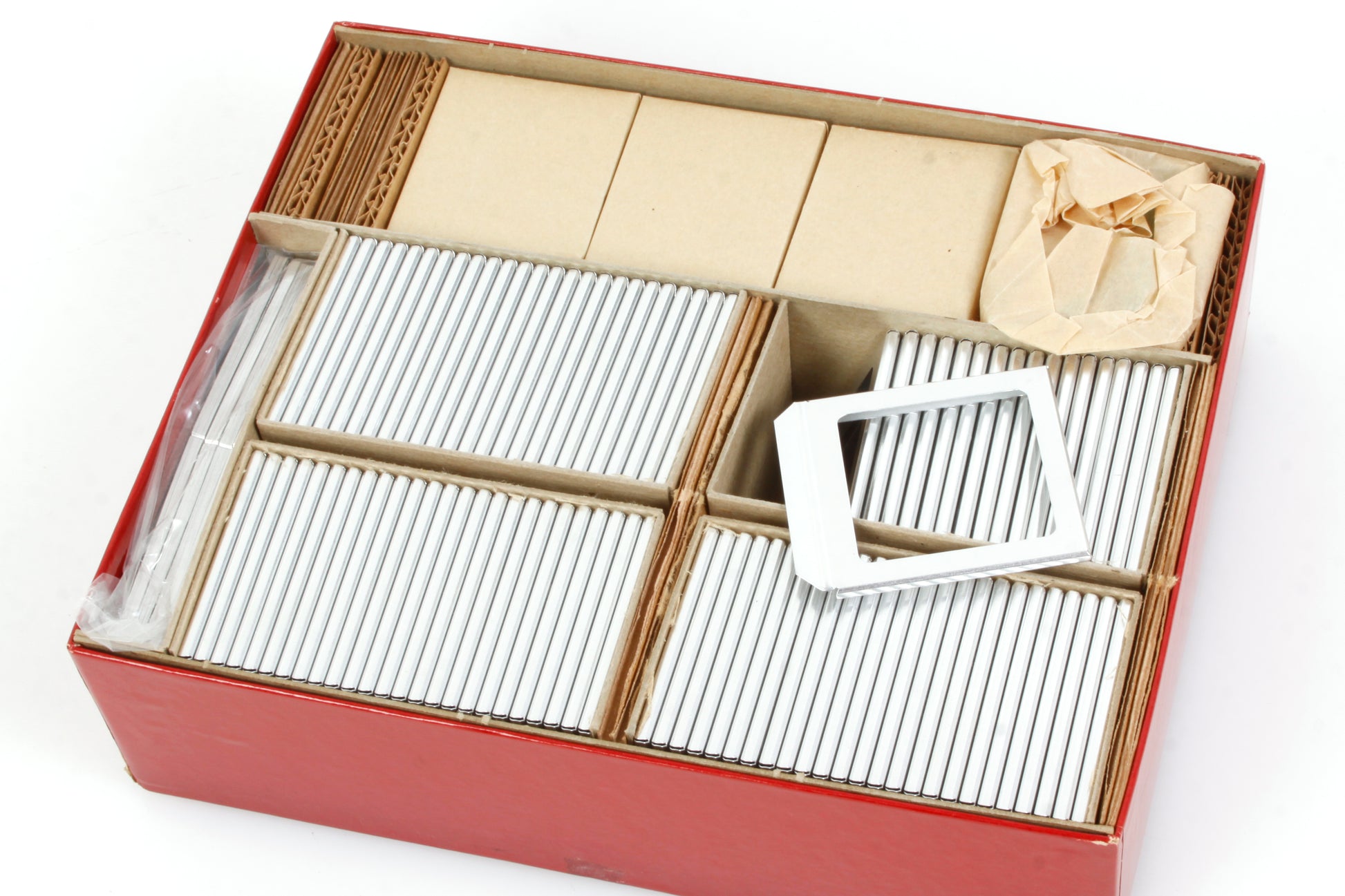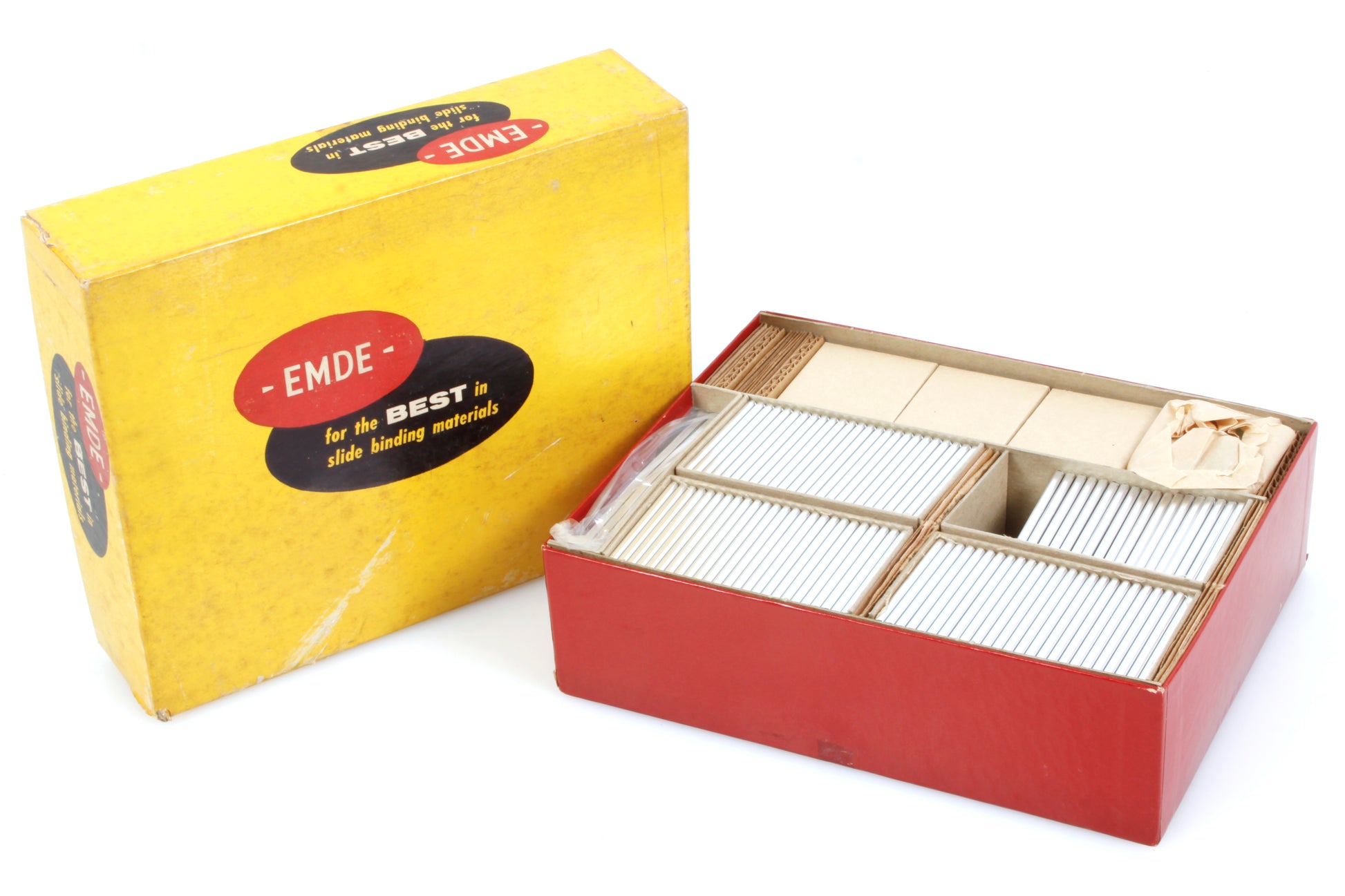 EMDE slide mounts for 120 film. Includes 97 2x2 inch aluminum frames with 35mm masks plus glass plates. New old stock. Comes with its original box and instructions. Some marks and damage to the box.