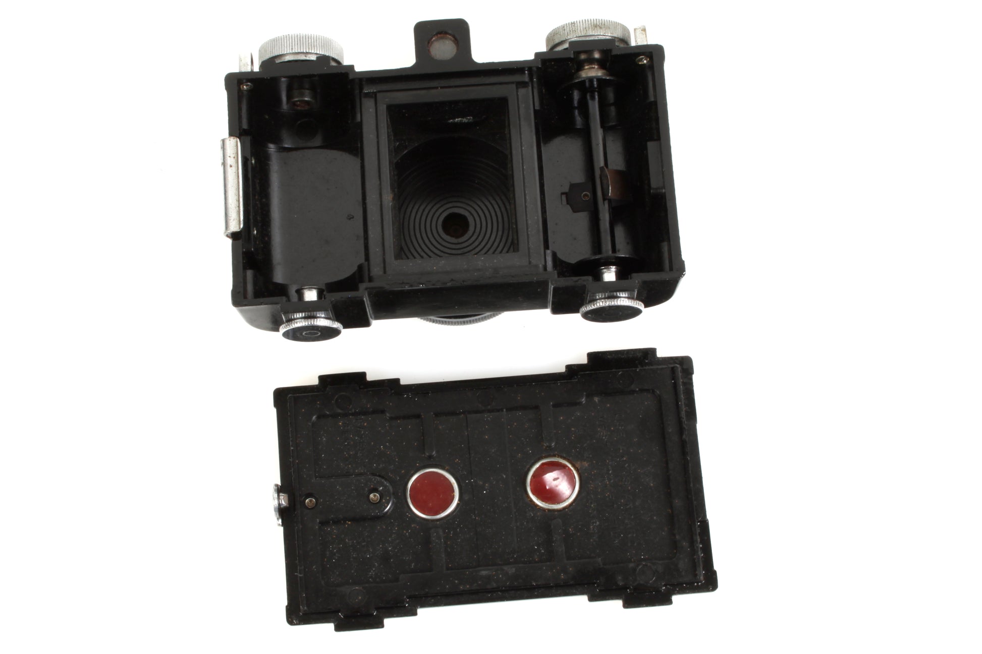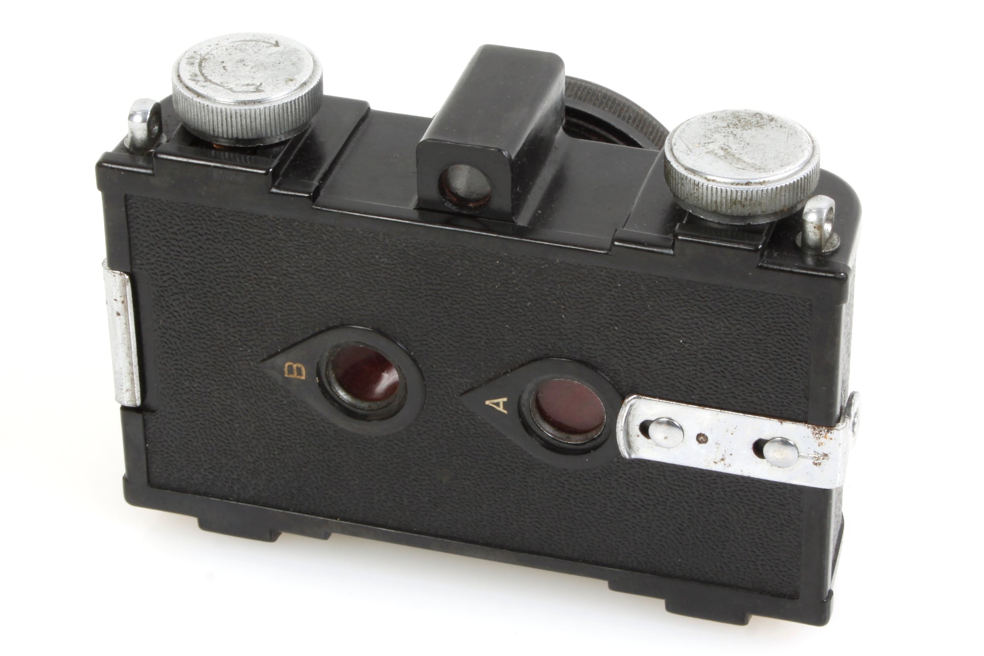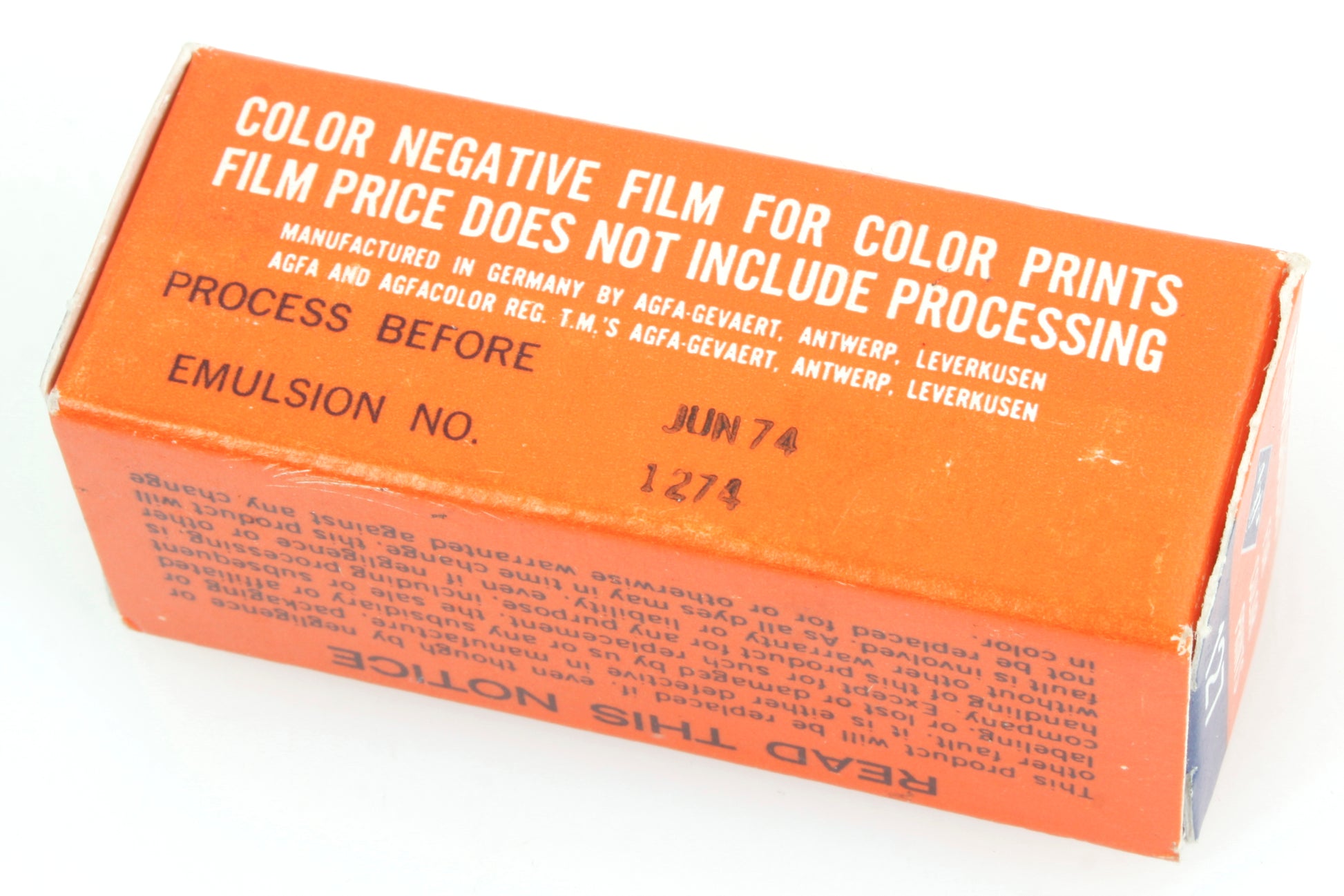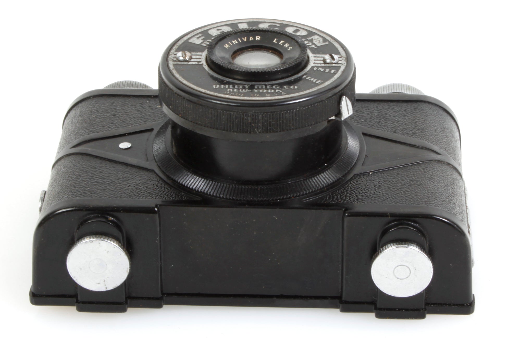 Falcon Minicam Junior with 50mm Minivar lens. Looks to be in working order - the shutter is firing fine on both settings, although it has not been tested with film or for accuracy. Cosmetically it has some general signs of age and use. There looks to be some dust and haze present to the lens but no fungus or scratches. Significant dust and haze present to the viewfinder. Comes with one roll of 127 film. The process before date is 1974 so we cannot guarantee its condition or usability but it is still sealed in its original packaging.